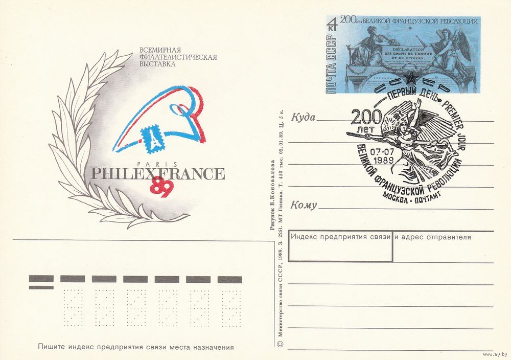 СССР 1989 ПК с ОМ со СГ Всемирная филателистическая выставка Филэксфранс-89, посвящённая 200-летию Великой французской революции (к3)