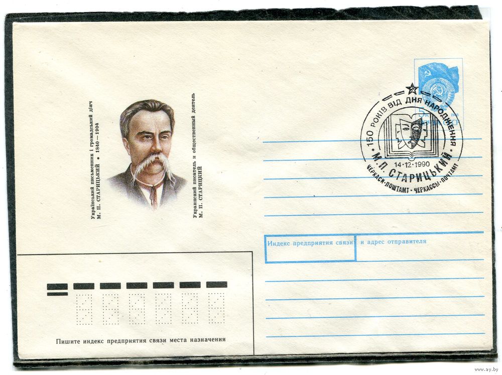 СССР 1990. ХМК. Конверт с СГ. М.П. Старицкий, украинский писатель. Гашение Черкассы 1990