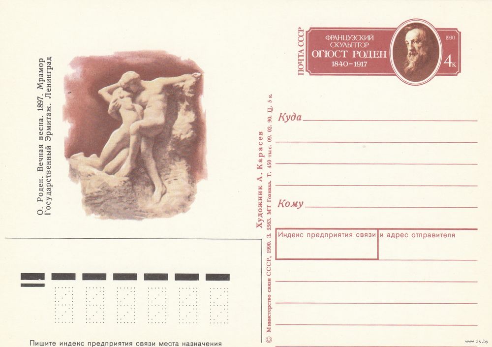 СССР 1990 ПК с ОМ 150-летие со дня рождения французского скульптора Огюста Родена (к3)