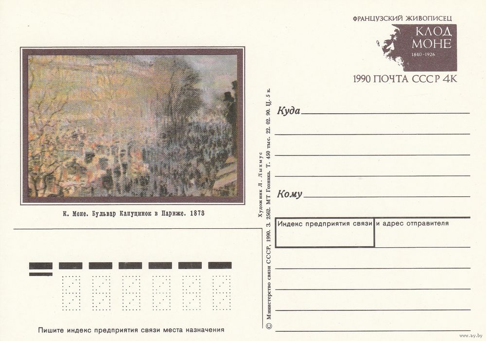 СССР 1990 ПК с ОМ 150-летие со дня рождения французского живописца Клода Моне (к3)