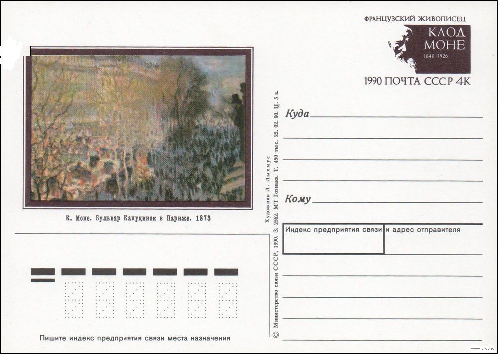 СССР 1990 ПК с ОМ N 214 (01.11.1990) 150 лет со дня рождения Клода Моне