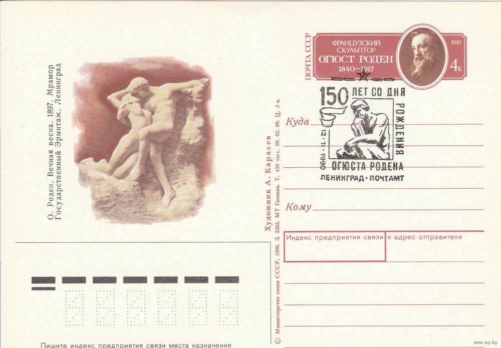 СССР 1990 ПК с ОМ со СГ 150-летие со дня рождения французского скульптора Огюста Родена (к3)