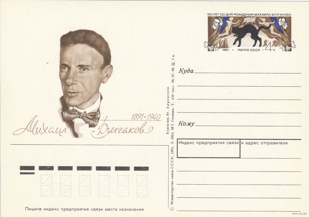 СССР 1991 ПК с ОМ 100-летие со дня рождения писателя М. А. Булгакова (к3)