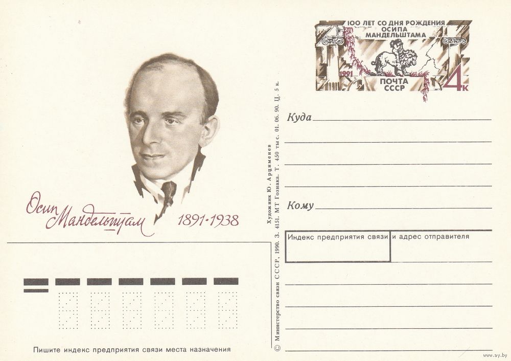 СССР 1991 ПК с ОМ 100-летие со дня рождения поэта О. Э. Мандельштама (к3)