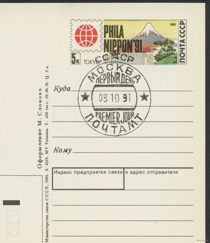 СССР 1991 ПК с ОМ Филателистическая выставка Филаниппон-91 Токио Япония СГ Москва ПД