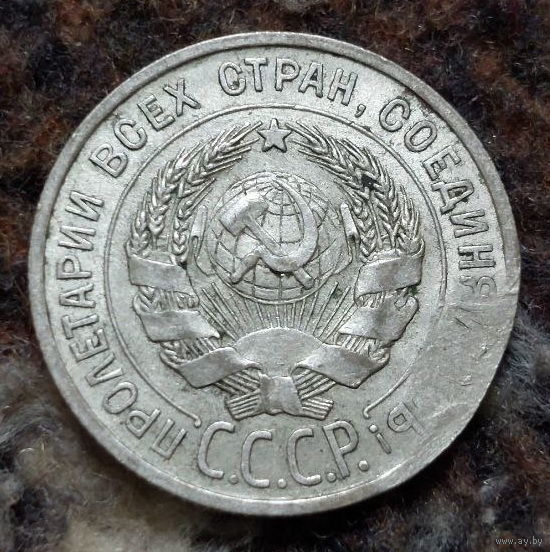 СССР 20 копеек 1925 года, AU. Сталин. "Пролетарии всех стран соединяйтесь!". Серебро. Брак чекана - сплющенный участок монеты (заготовки). Сторгуй за свою цену, предложи обмен!