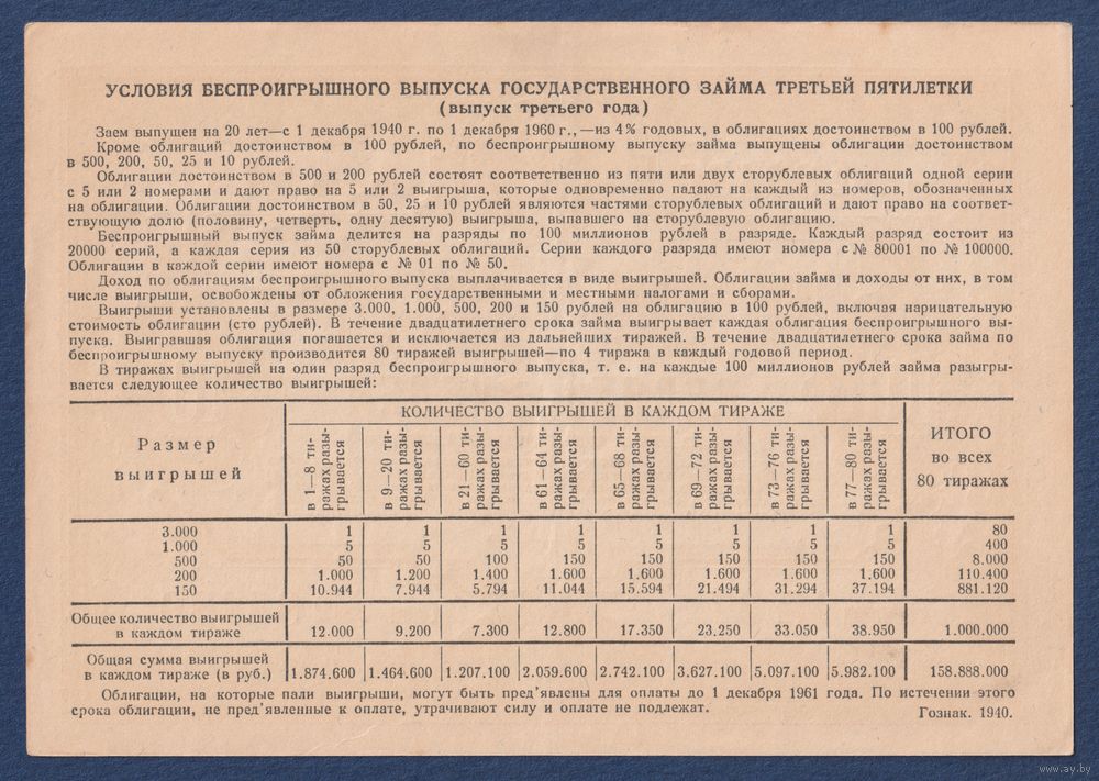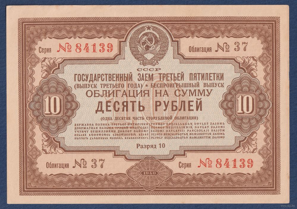 СССР, облигация 10 рублей 1940 г, Государственный заем третьей пятилетки (выпуск 3-го года), XF