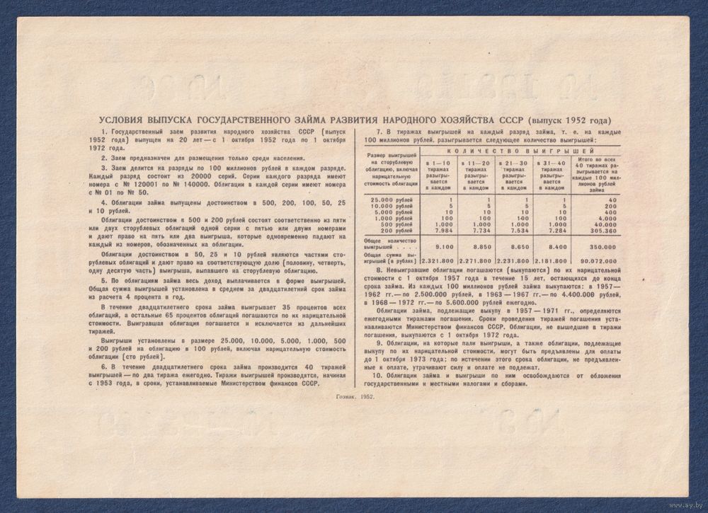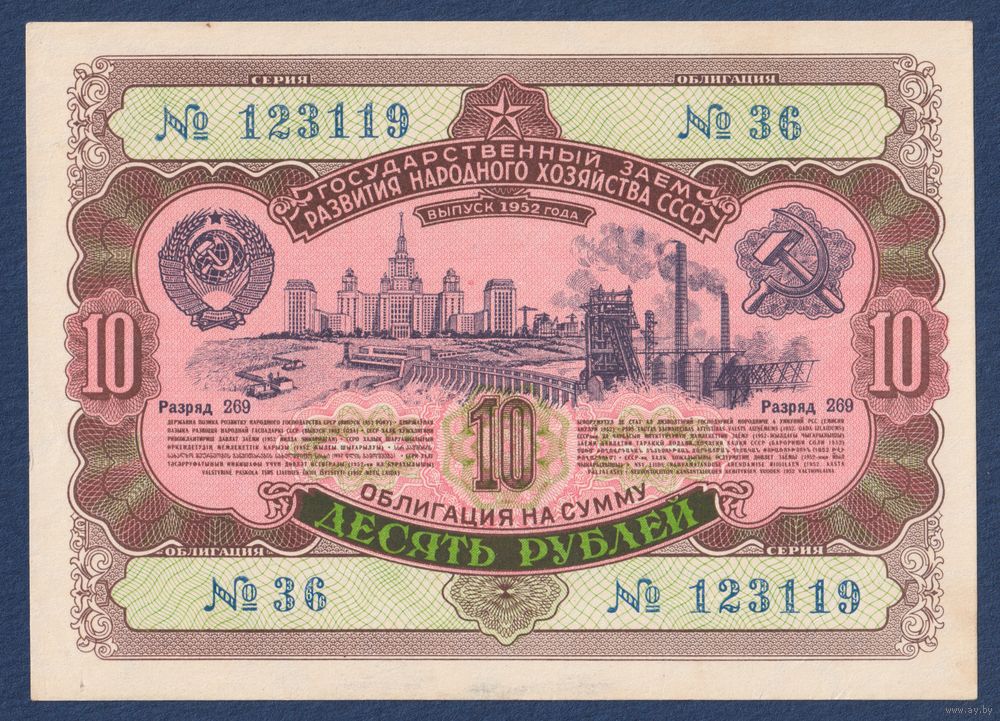СССР, облигация 10 рублей 1952 г, Государственный заем развития народного хозяйства, aUNC+