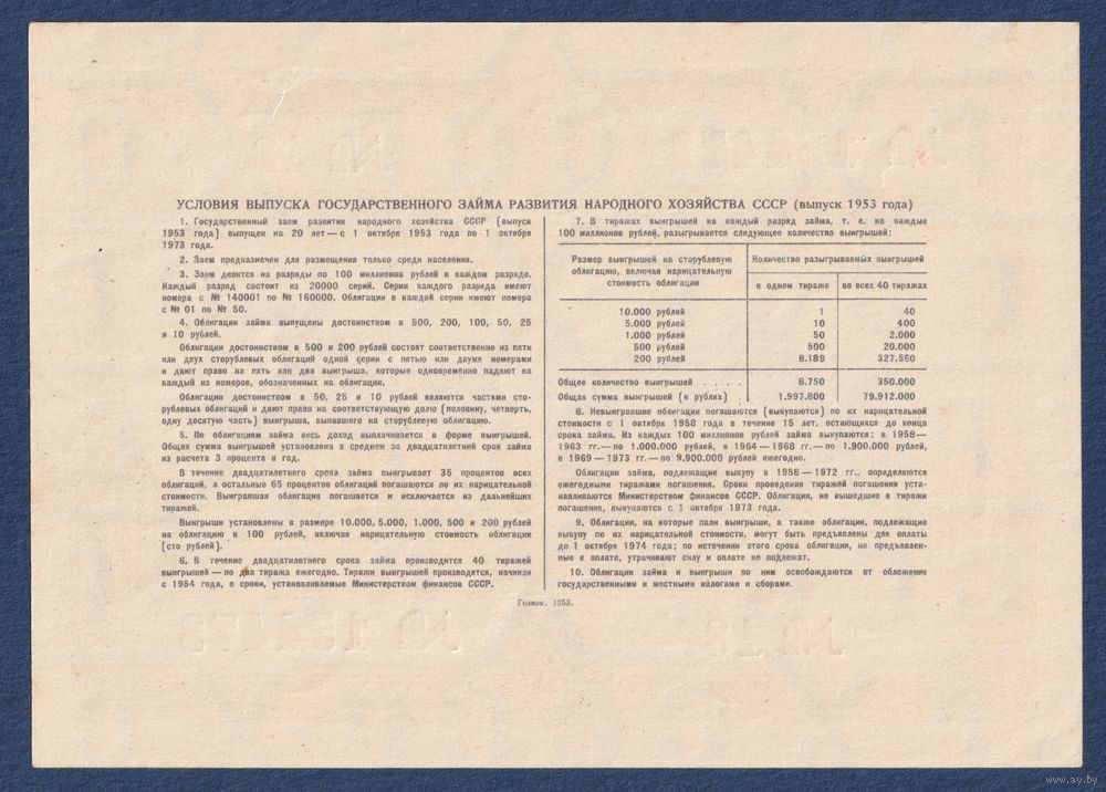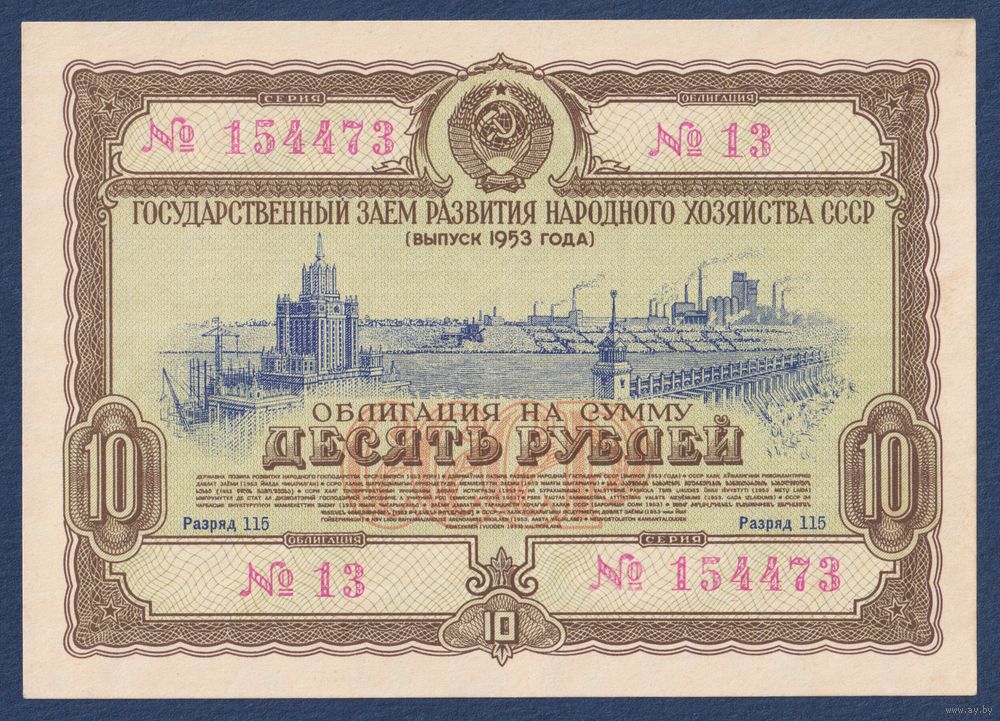 СССР, облигация 10 рублей 1953 г, Государственный заем развития народного хозяйства, UNC-
