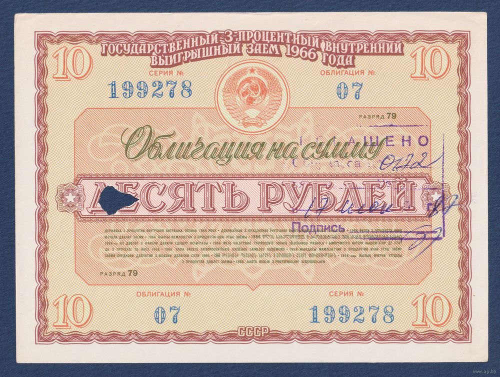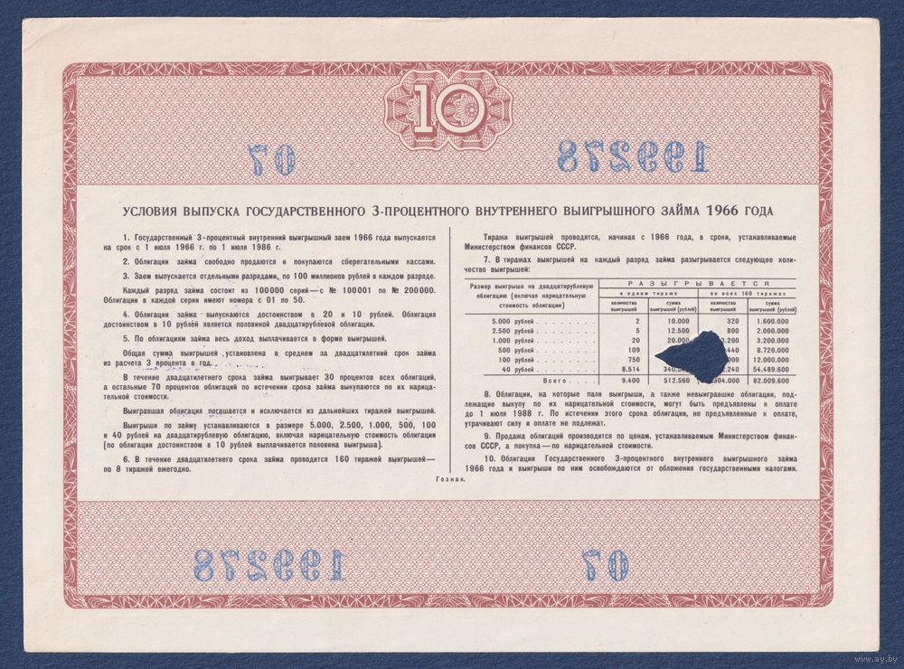 СССР, облигация 10 рублей 1966 г, Государственный 3-процентный внутренний выигрышный заем (с гашением), XF
