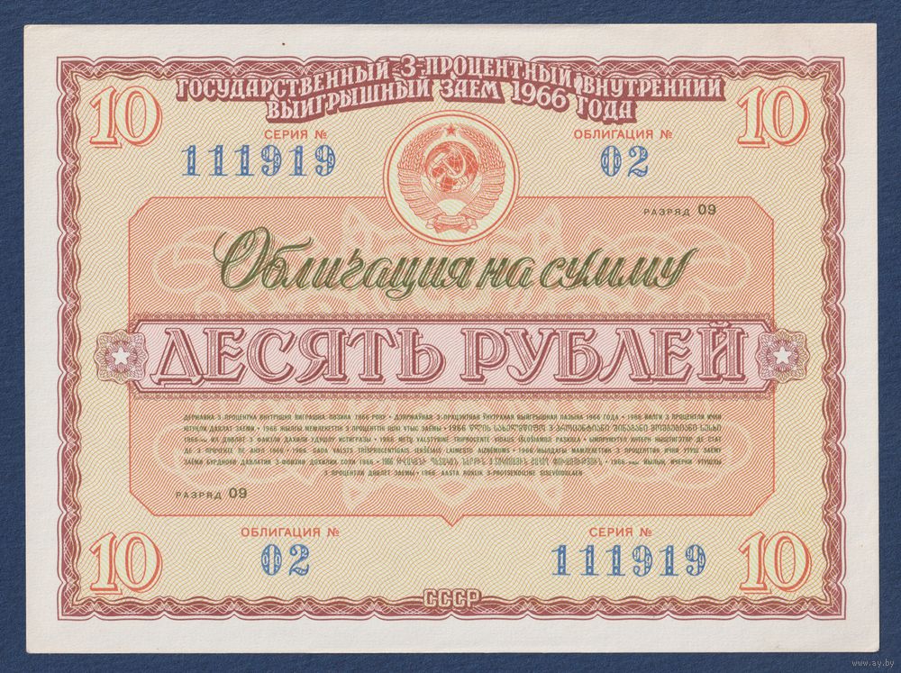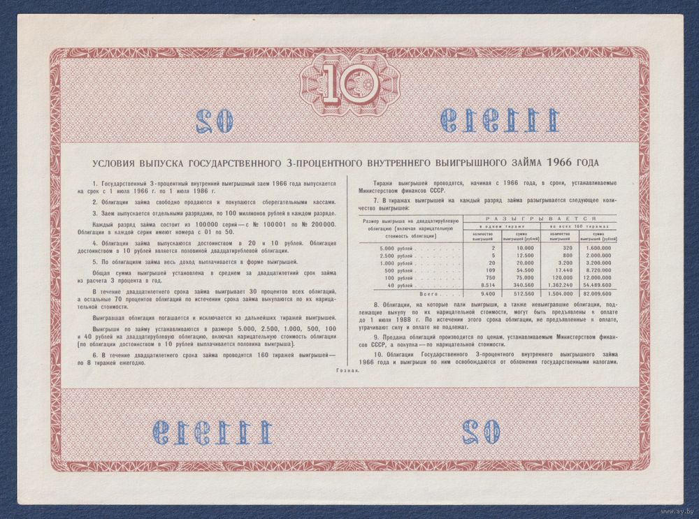 СССР, облигация 10 рублей 1966 г, Государственный 3-процентный внутренний выигрышный заем, UNC-