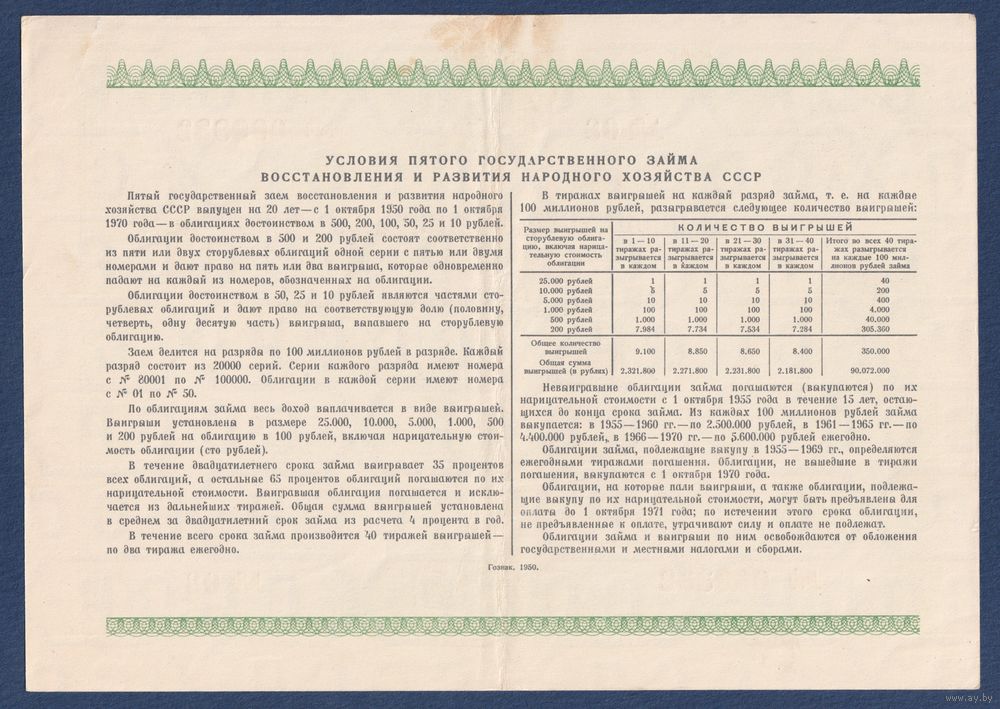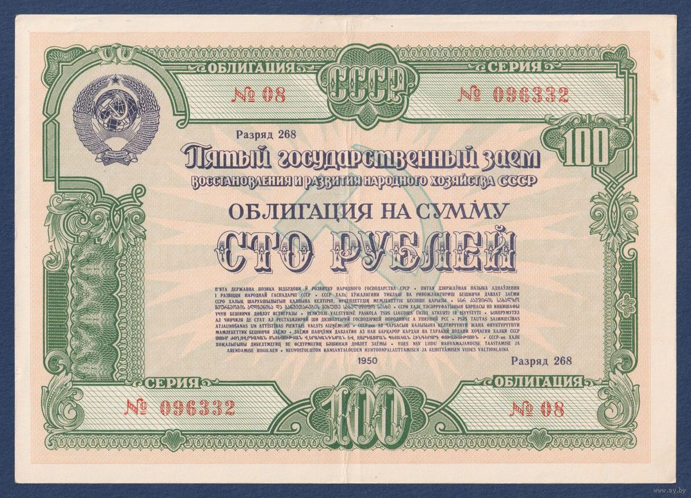 СССР, облигация 100 рублей 1950 г, Пятый государственный заем восстановления и развития народного хозяйства, XF