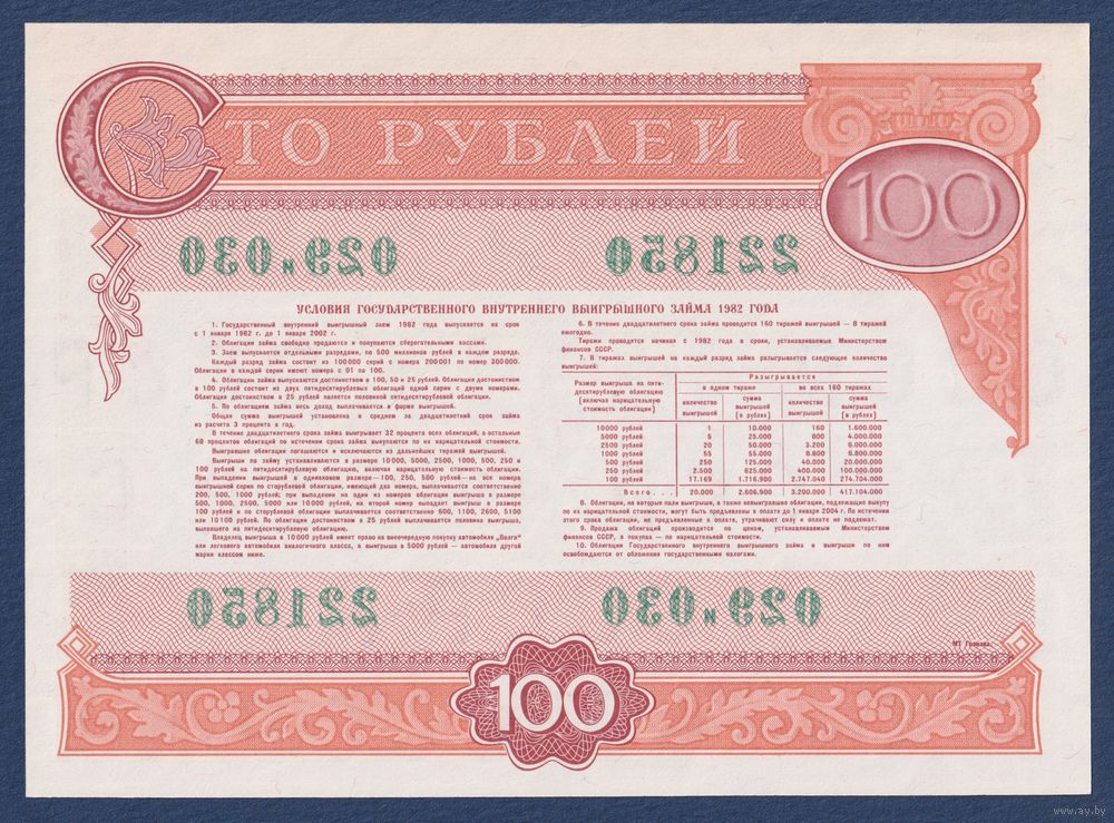 СССР, облигация 100 рублей 1982 г, Государственный выигрышный внутренний заем, UNC-