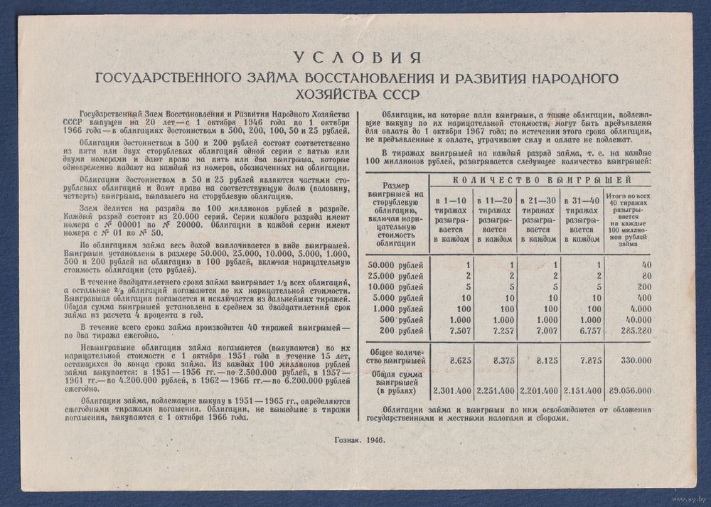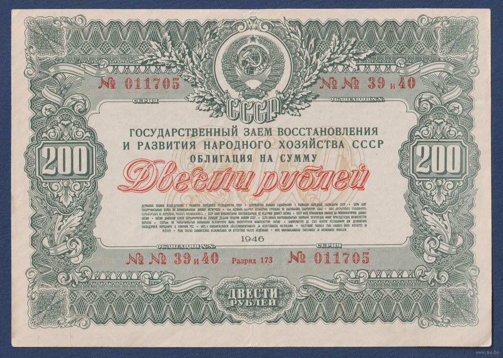 СССР, облигация 200 рублей 1946 г, Государственный заем восстановления и развития народного хозяйства, XF+