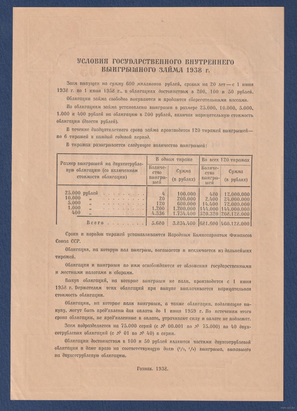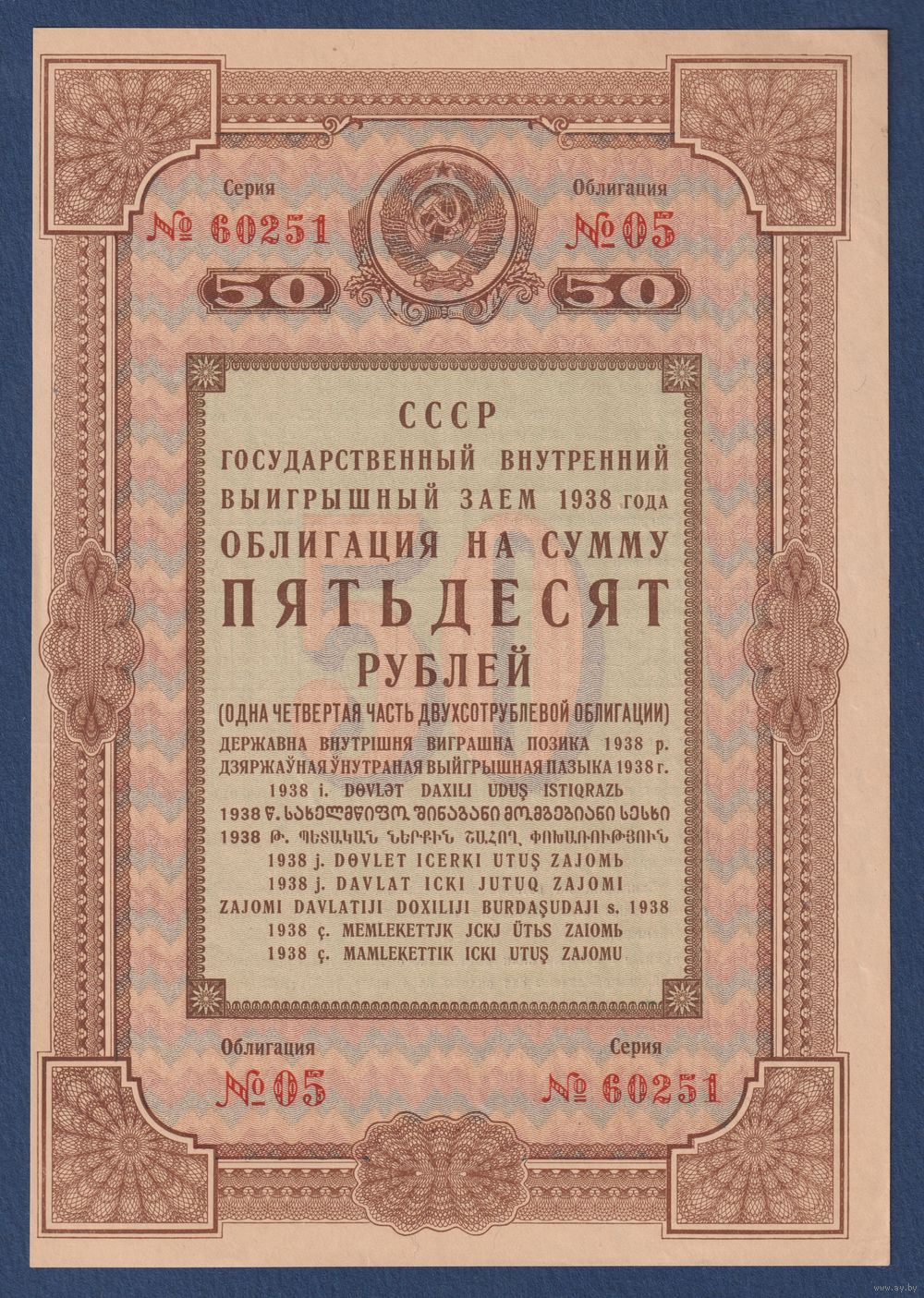 СССР, облигация 50 рублей 1938 г, Государственный внутренний выигрышный заем, XF