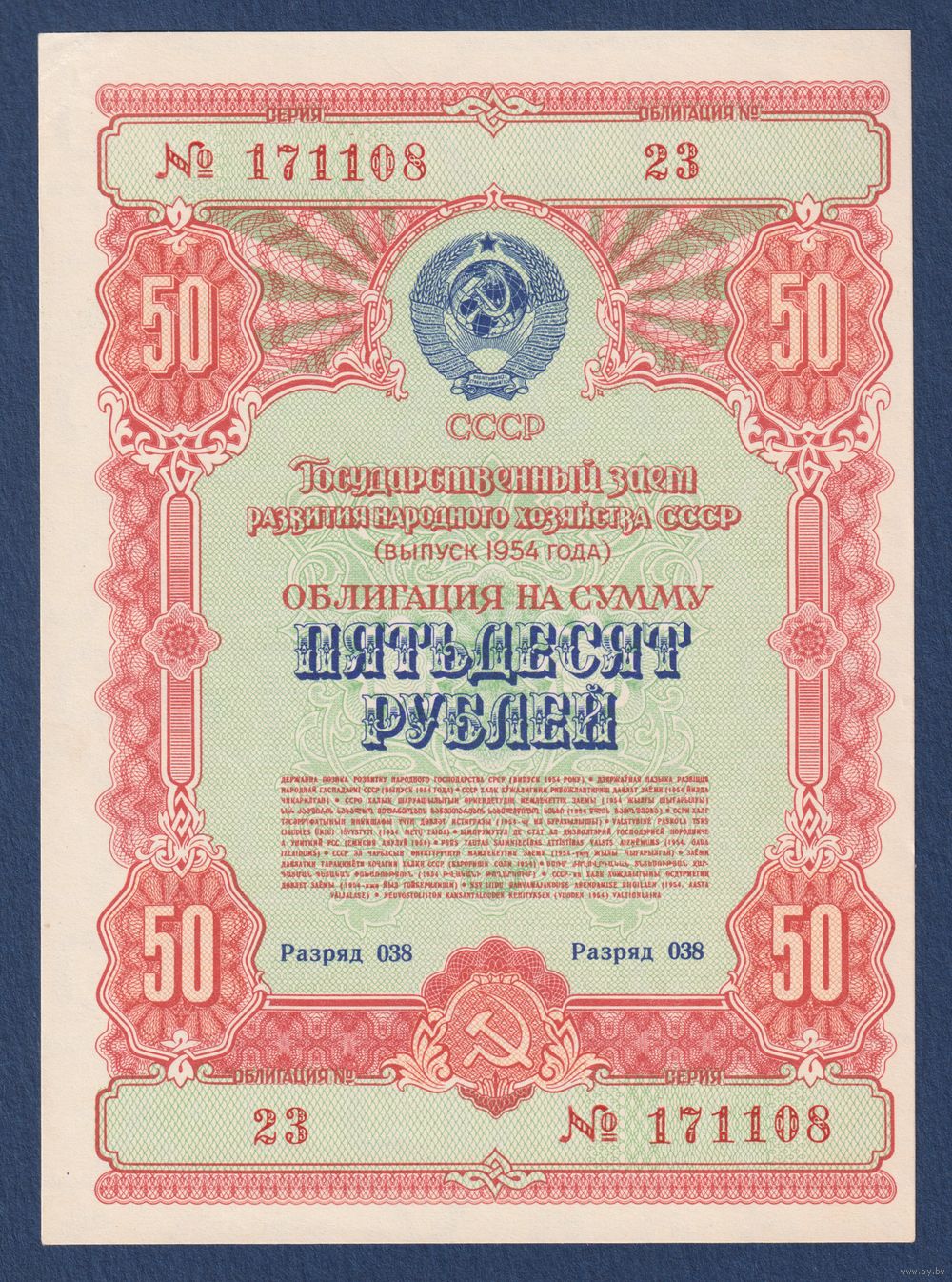 СССР, облигация 50 рублей 1954 г, Государственный заем развития народного хозяйства, XF+