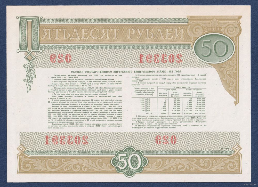 СССР, облигация 50 рублей 1982 (1986) г, Государственный выигрышный внутренний заем, UNC-