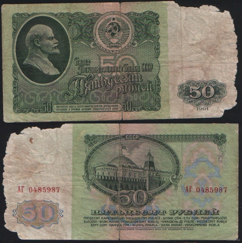 СССР P-235a.1 50 рублей 1961 Префикс АА-АЯ Желтовато-серая бумага ' АГ 0485987 ТОРГ/ВАША ЦЕНА