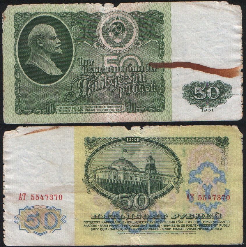 СССР P-235a.1 50 рублей 1961 Префикс АА-АЯ Желтовато-серая бумага ' АТ 5547370 ТОРГ/ВАША ЦЕНА