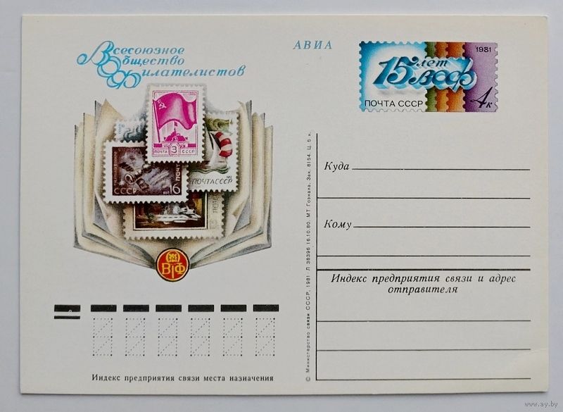 СССР.Почтовая карточка с ОМ.1981. "15 лет Всесоюзному обществу филателистов"
