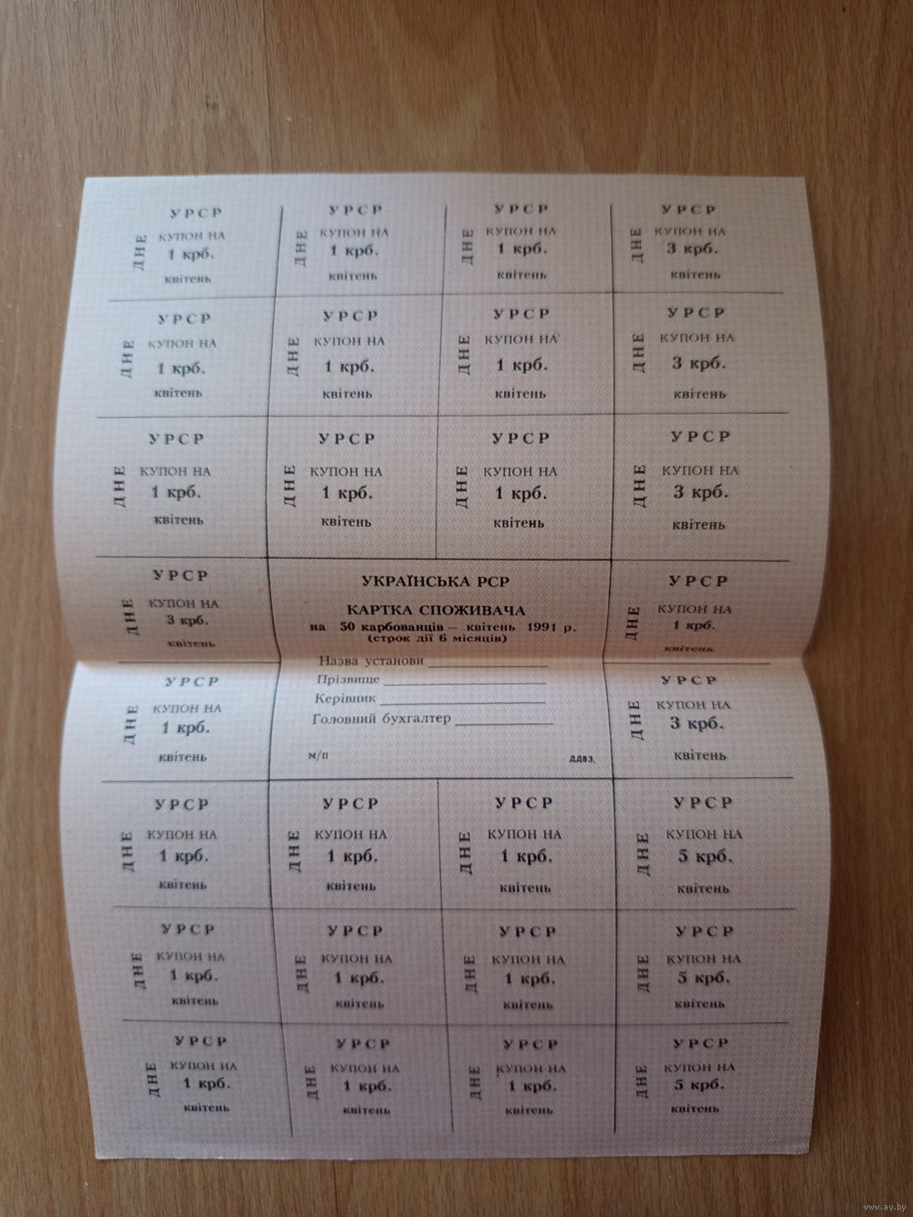 СССР Украинская ССР полный лист купонов выданный в апреле 1991 года Днепропетровская область