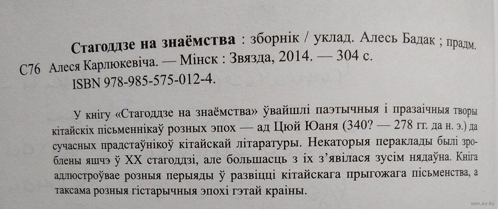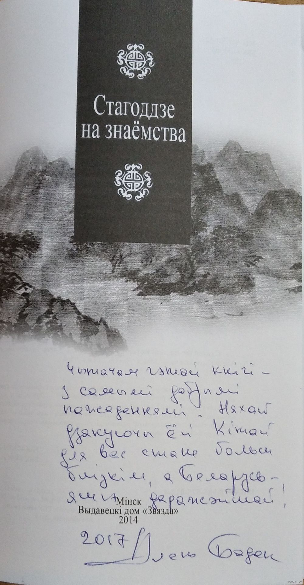 Стагоддзе на знаёмства: паэтычные и празаічныя творы кітайских пісьменнікаў розных эпох. Аўтограф укладальніка - Алеся Бадака. Мінск : Звязда, 2014 г. 302 с. Цверды пераплет.