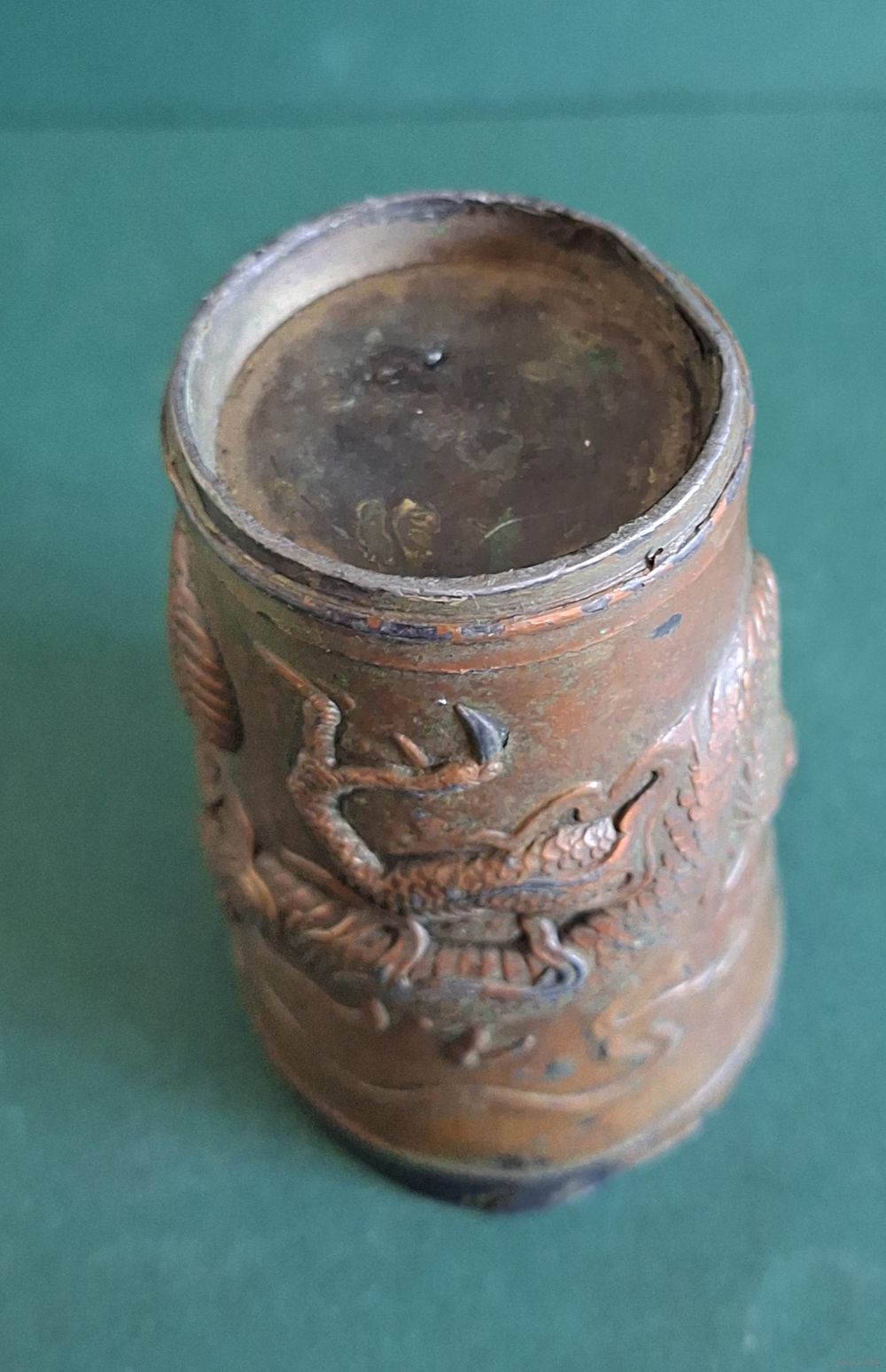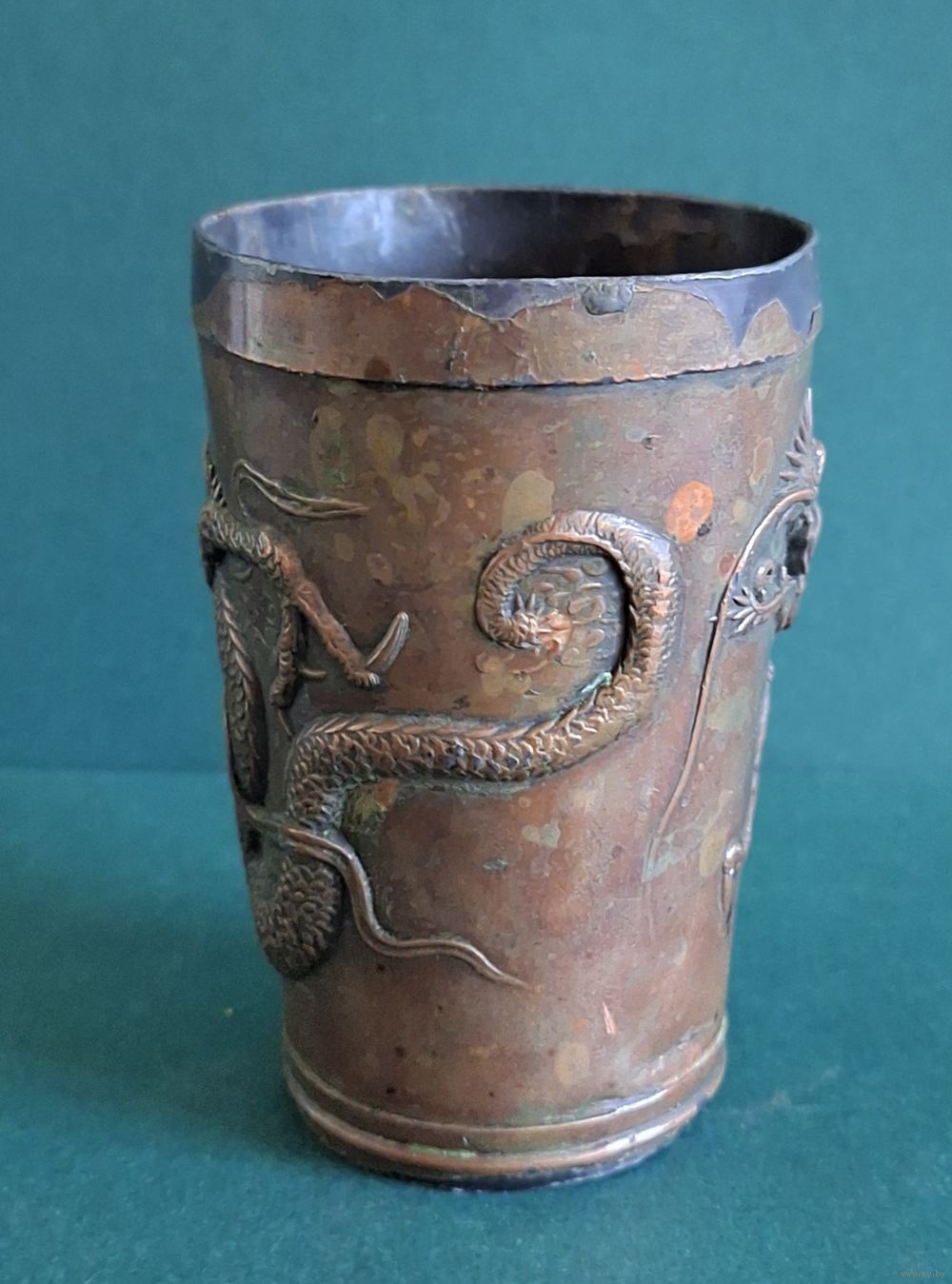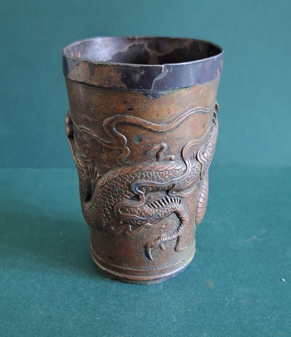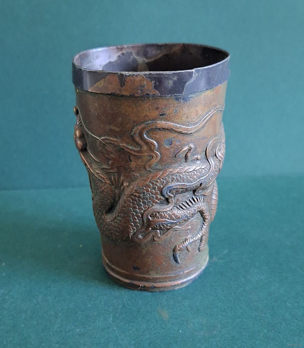 Стакан, старый Китай, материал металл покрытый медью. Высота: 8,6 см, диаметр верх: 5,7 см, низ: 4,2 см., толщина металла: 1мм. Деформация по верхнему ободку, трещинка по канту (6 фото), длинной 1 см. Старый, аутентичный предмет.