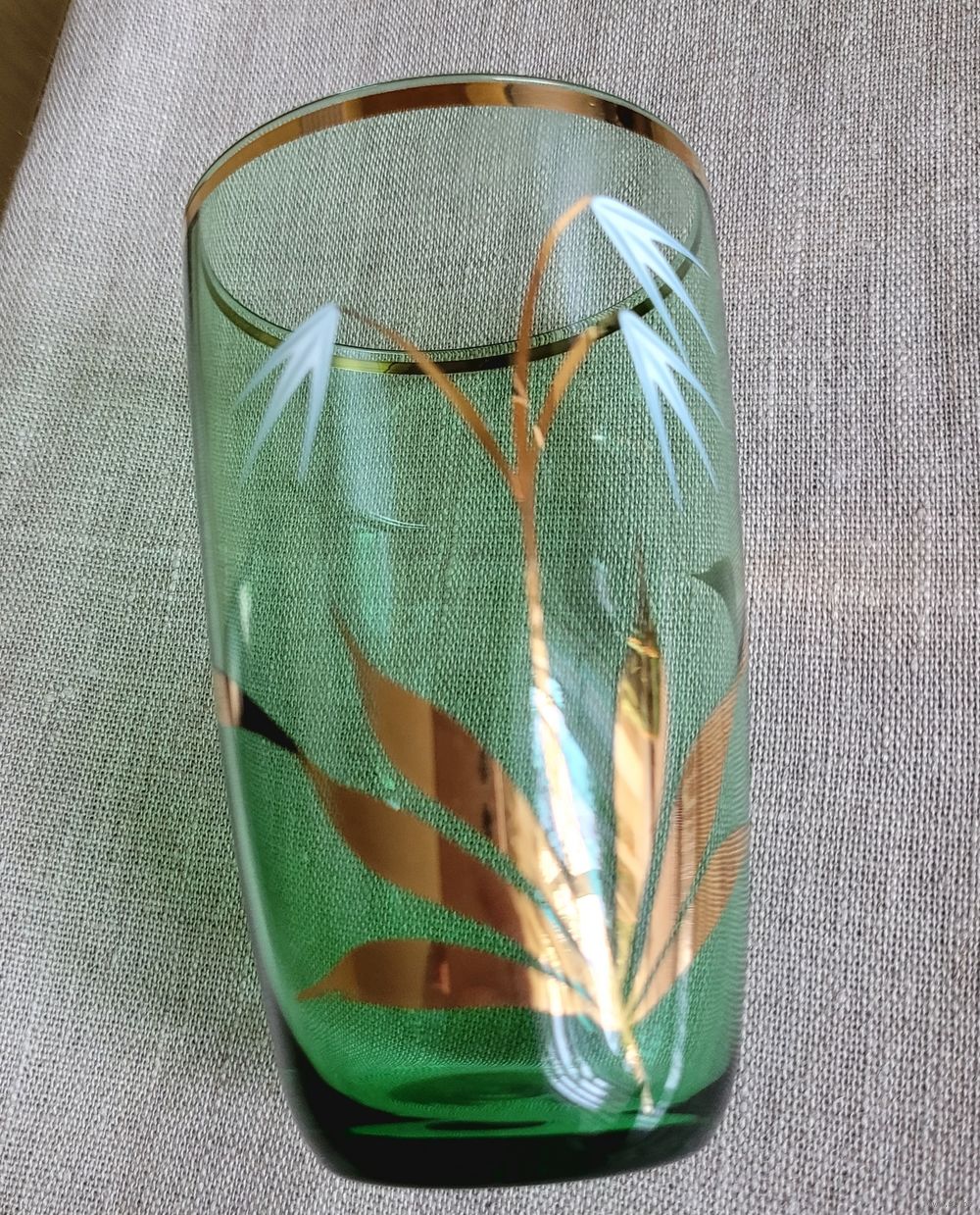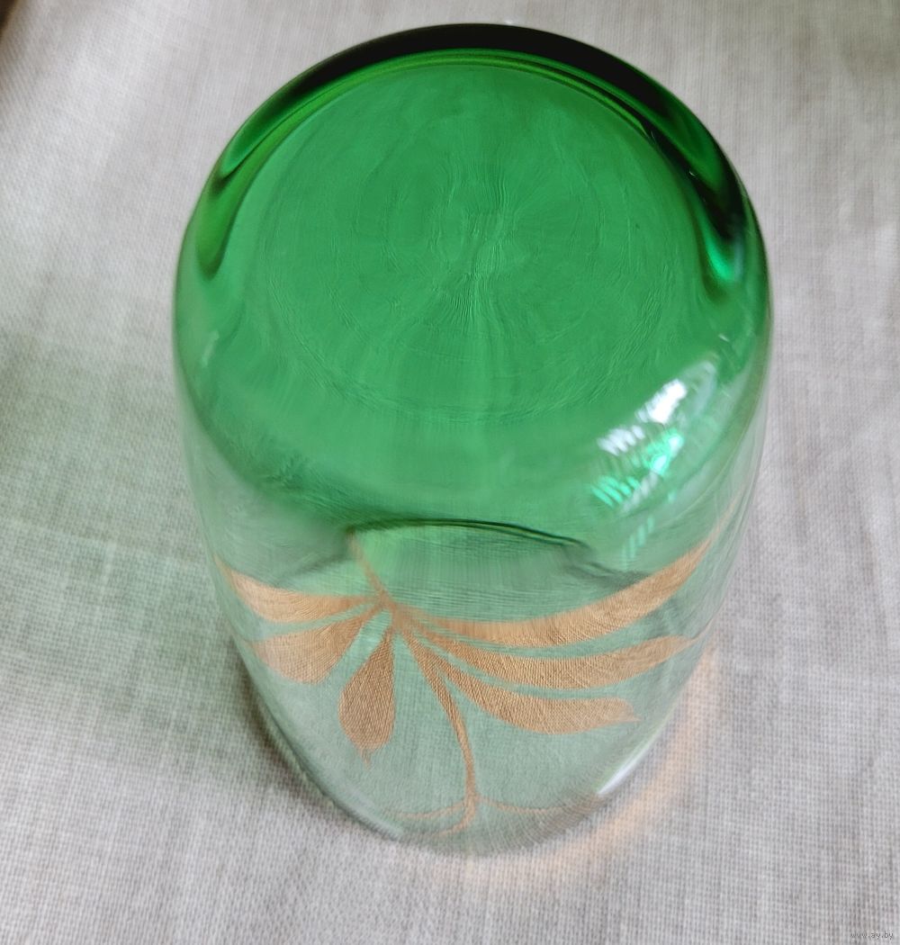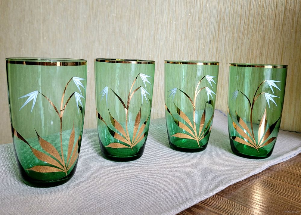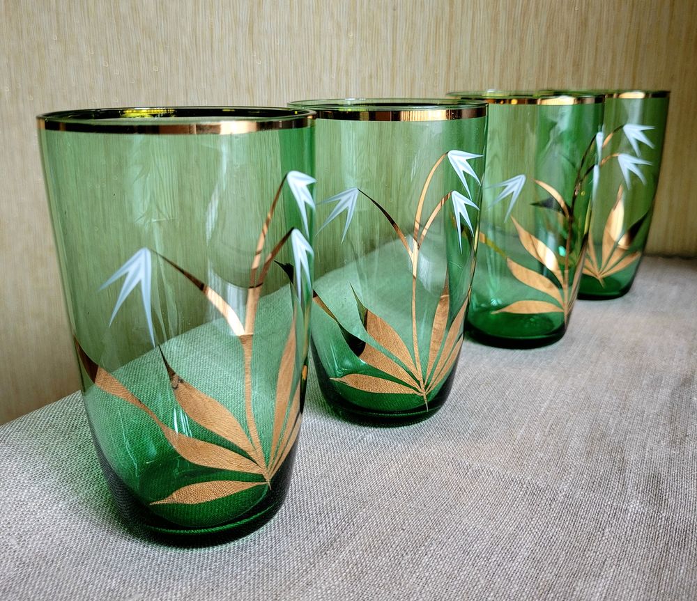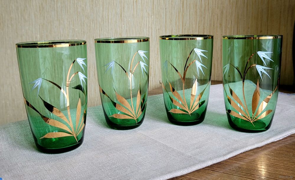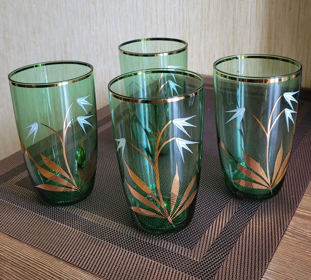 Стаканы на 300 мл, 11,5×7 см. Богемское зелёное стекло, золочение, ручная роспись. Чехословакия периода СССР. В отличном состоянии без дефектов. Одним лотом 4 шт.