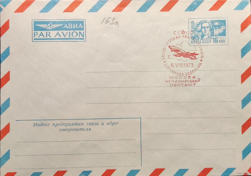 Стандартный маркированный конверт СССР. 1972г. № 1.217а (Дымшиц). АВИА. Печать голубая и оранжевая. Спецгашение.