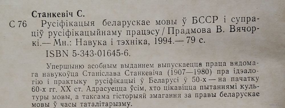 Станіслаў Станкевіч. Русіфікацыя беларускай мовы ў БССР і супраціў русіфікацыйнаму працэсу. Мінск : Навука і тэхніка, 1994 г 77 с. Мяккая вокладка.