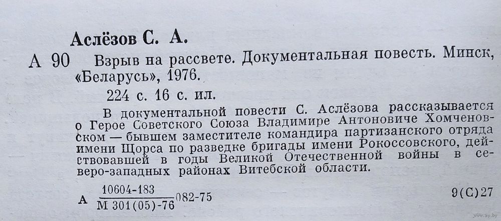 Станислав Аслёзов. Взрыв на рассвете: документальная повесть: о Герое Советского Союза В. А. Хомченовском. Минск : Беларусь, 1976 г. 222 с. Твердый переплет.