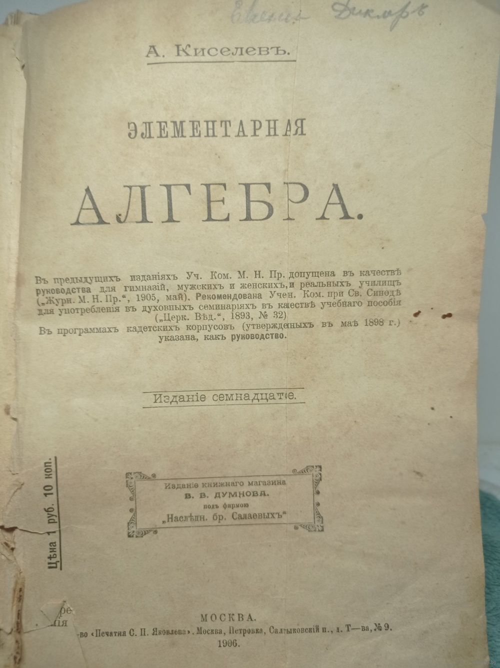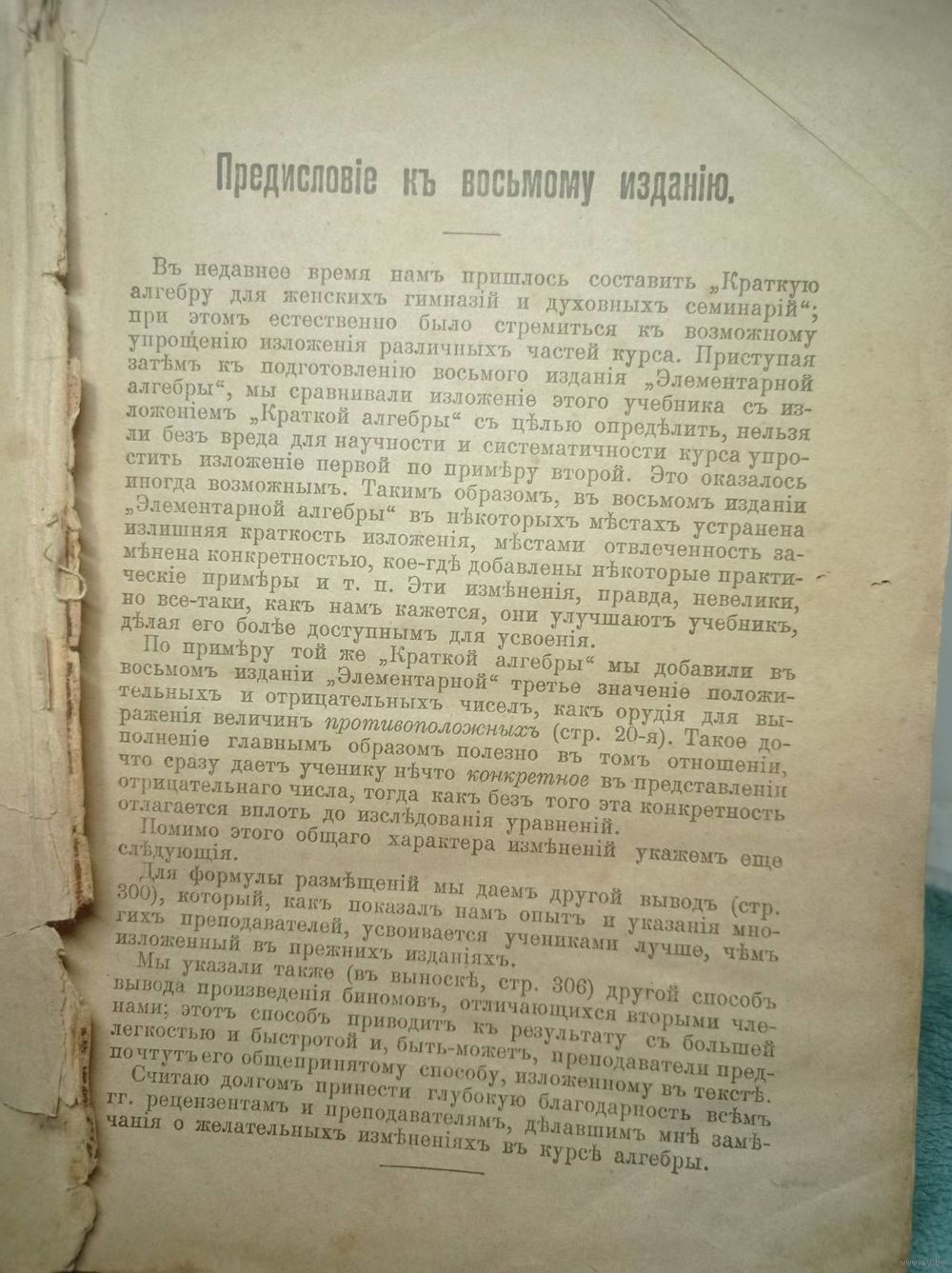 Старенький учебник по Элементарной алгебре, выпуска 1906 года, выпущен в Москве. состояние вполне нормальное для книги, которой уже 120 лет и которой пользовались довольно активно.