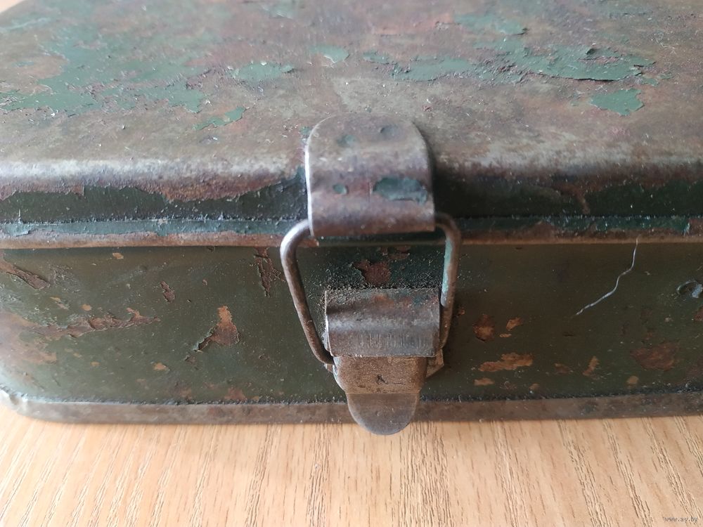 Старая металлическая аптечка для военной автотракторной техники. СССР, вторая половина прошлого века.