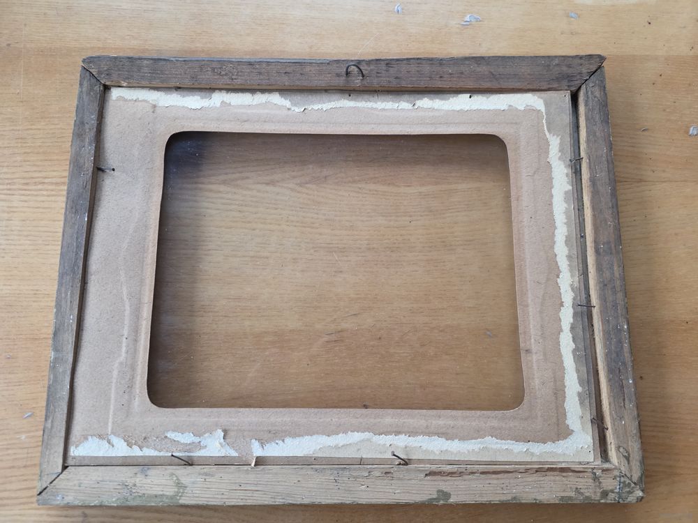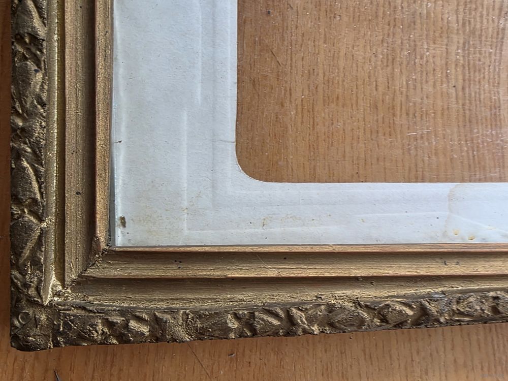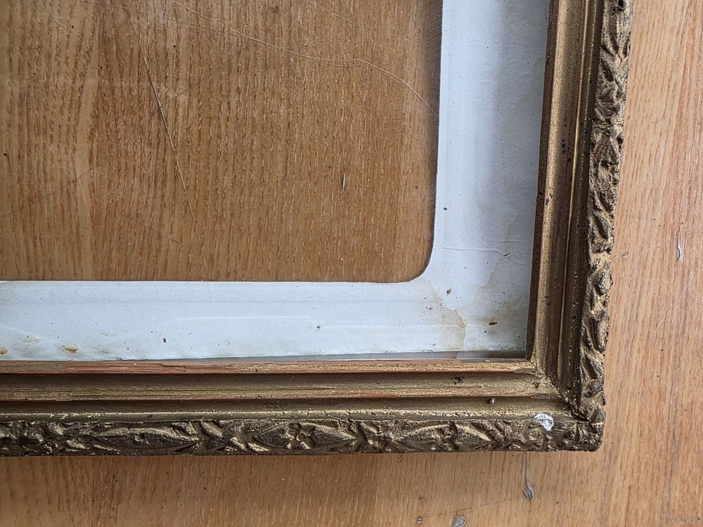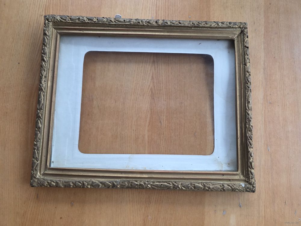 35,5×44 см, ширина рамы 4 см, размер внутри бумажной вставки 28×22 см. Дерево, гипс.
