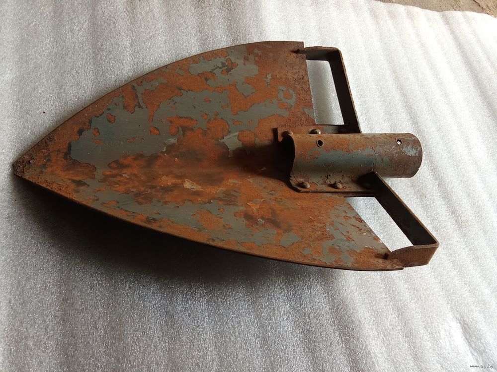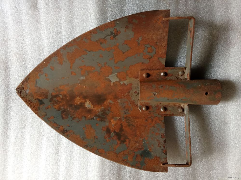 Старая штыковая лопата необычного вида. Общая длина 35 см. Местами краска утрачена, и поверхностная ржавчина. Состояние вполне приемлемое.