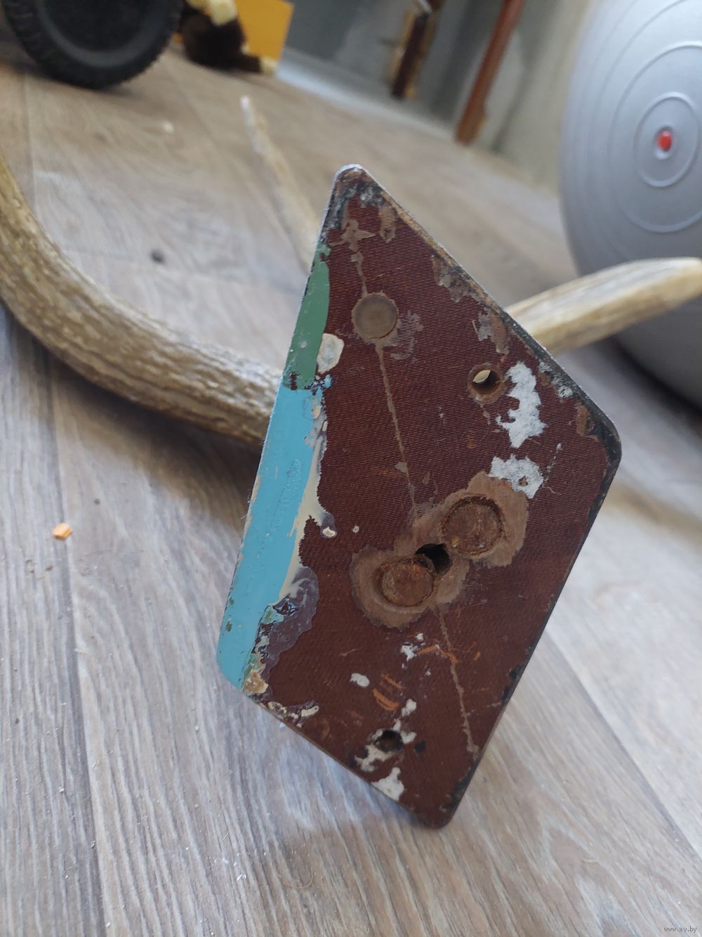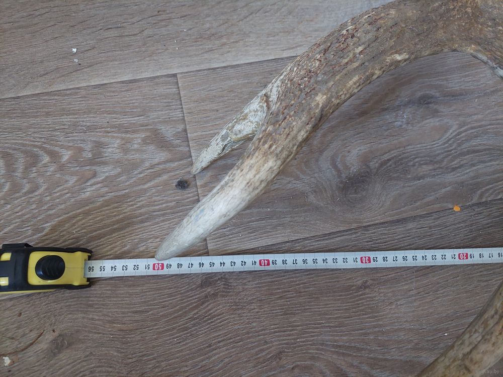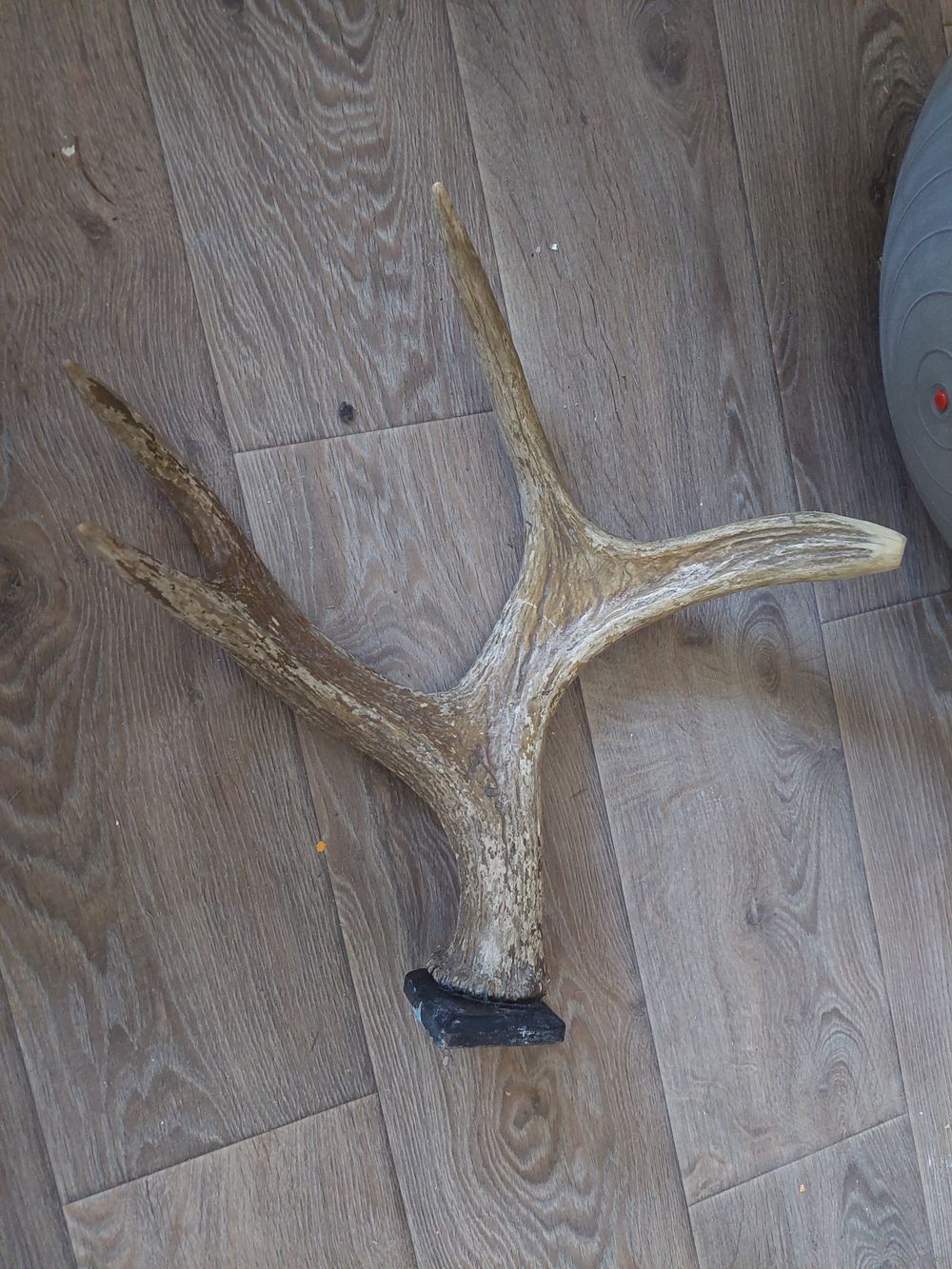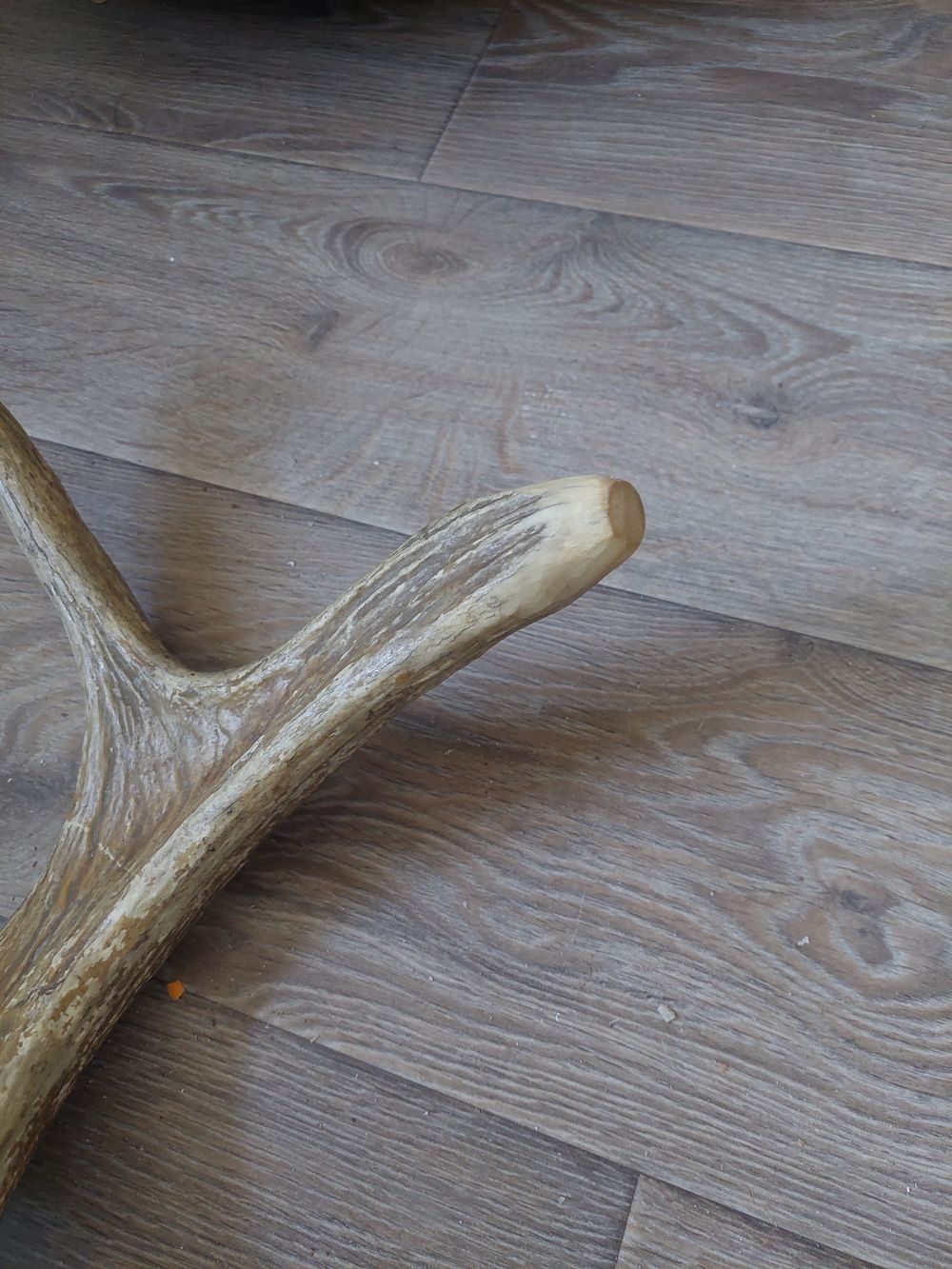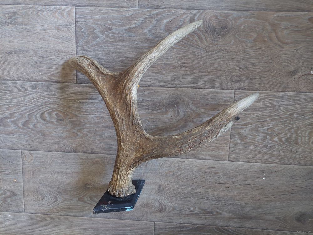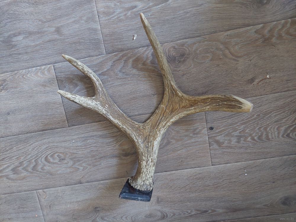 Старая вешалка из рогов оленя. Один конец обточен, лак почти стёрт. Приблизительный размер 50х50 см.