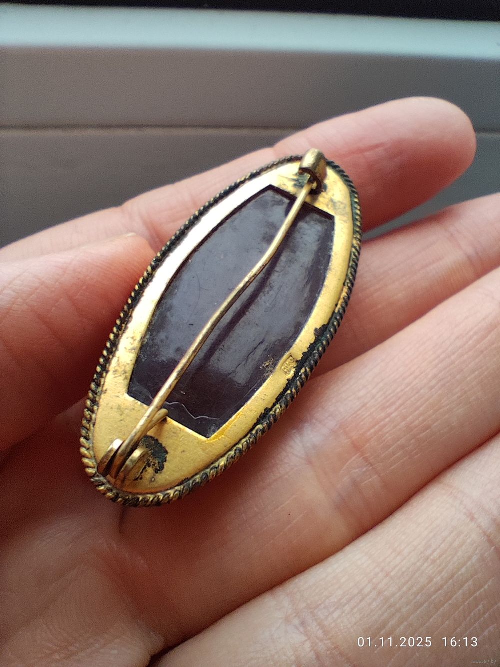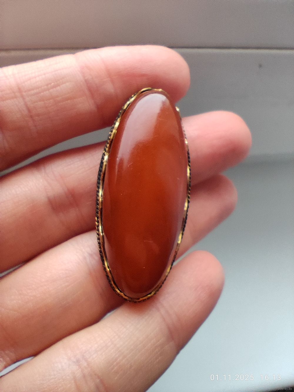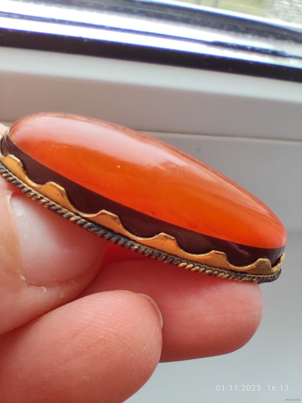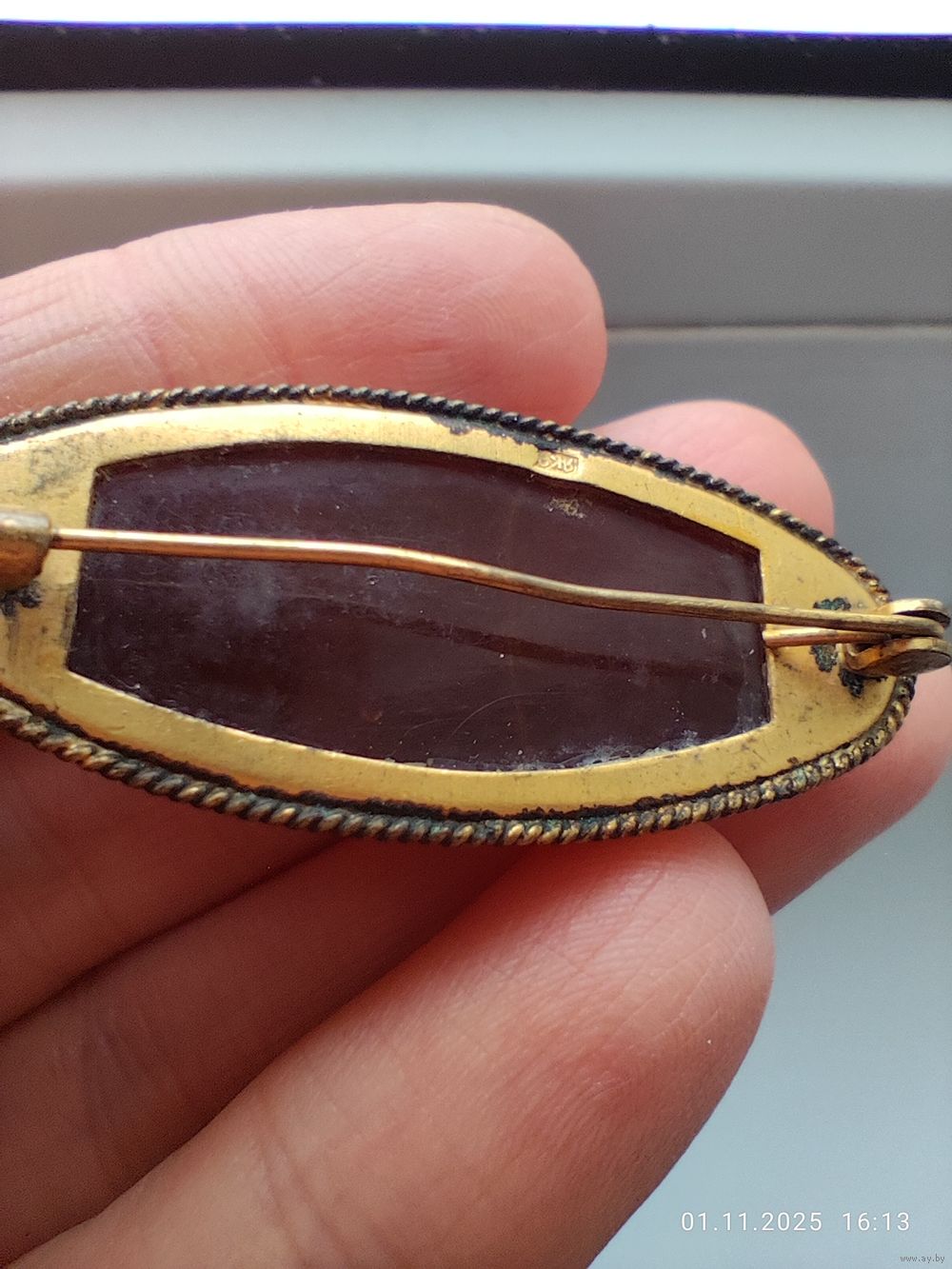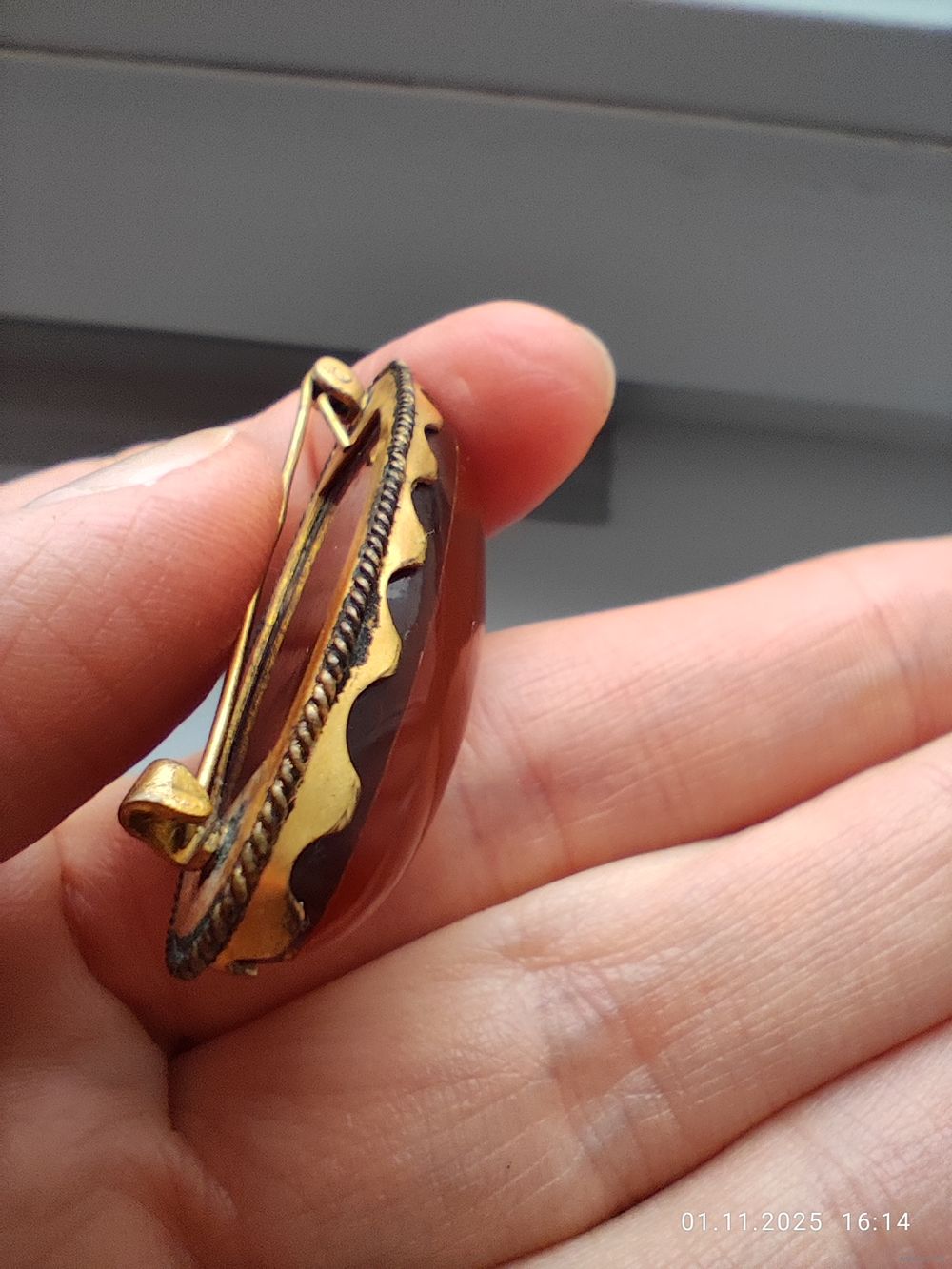 Нижний слой темного янтаря, сверху - классический. Клеймо, замок рабочий. Есть загрязнения, возможно потери позолоты (чистить янтарь я не умею и не берусь)