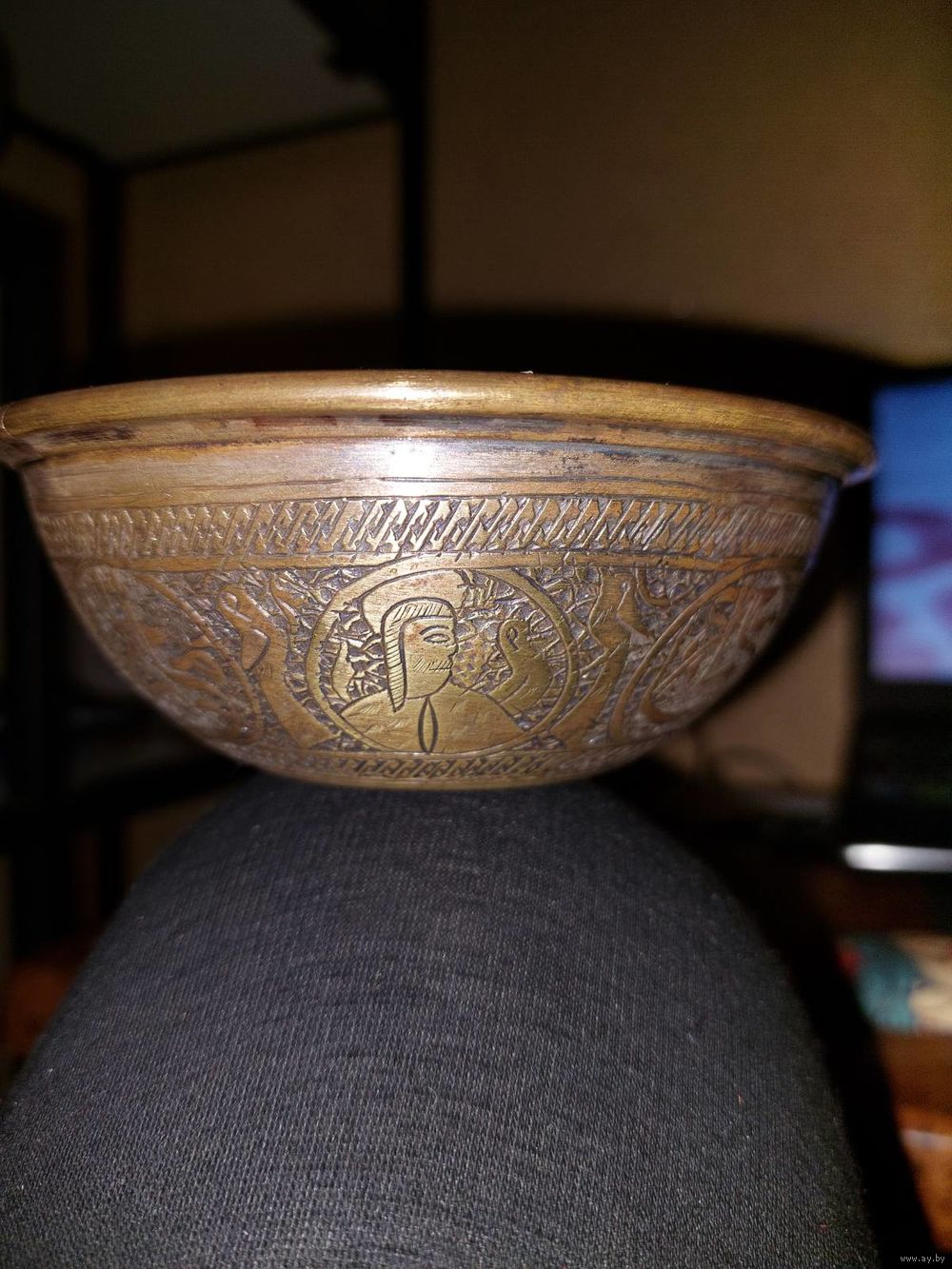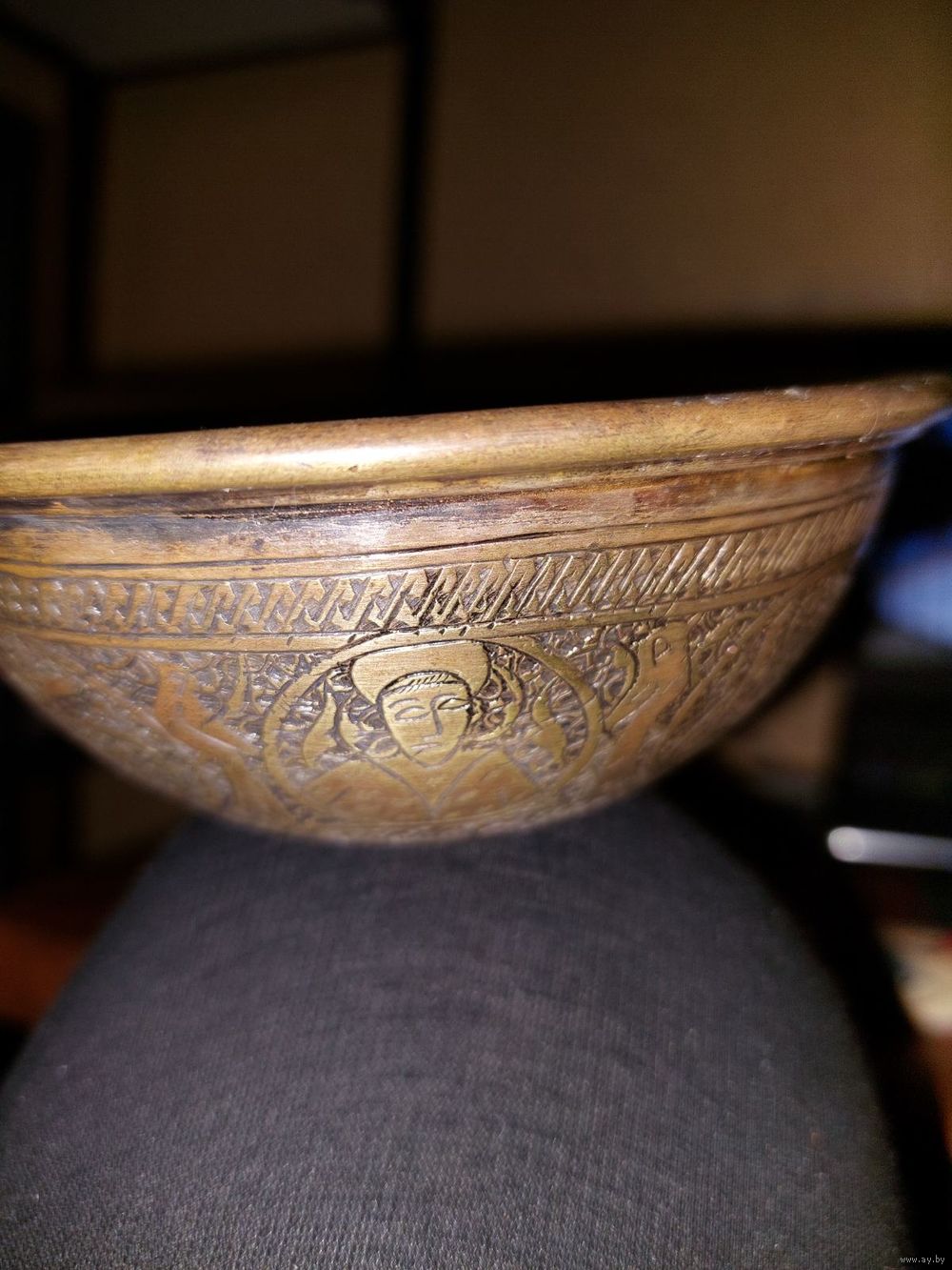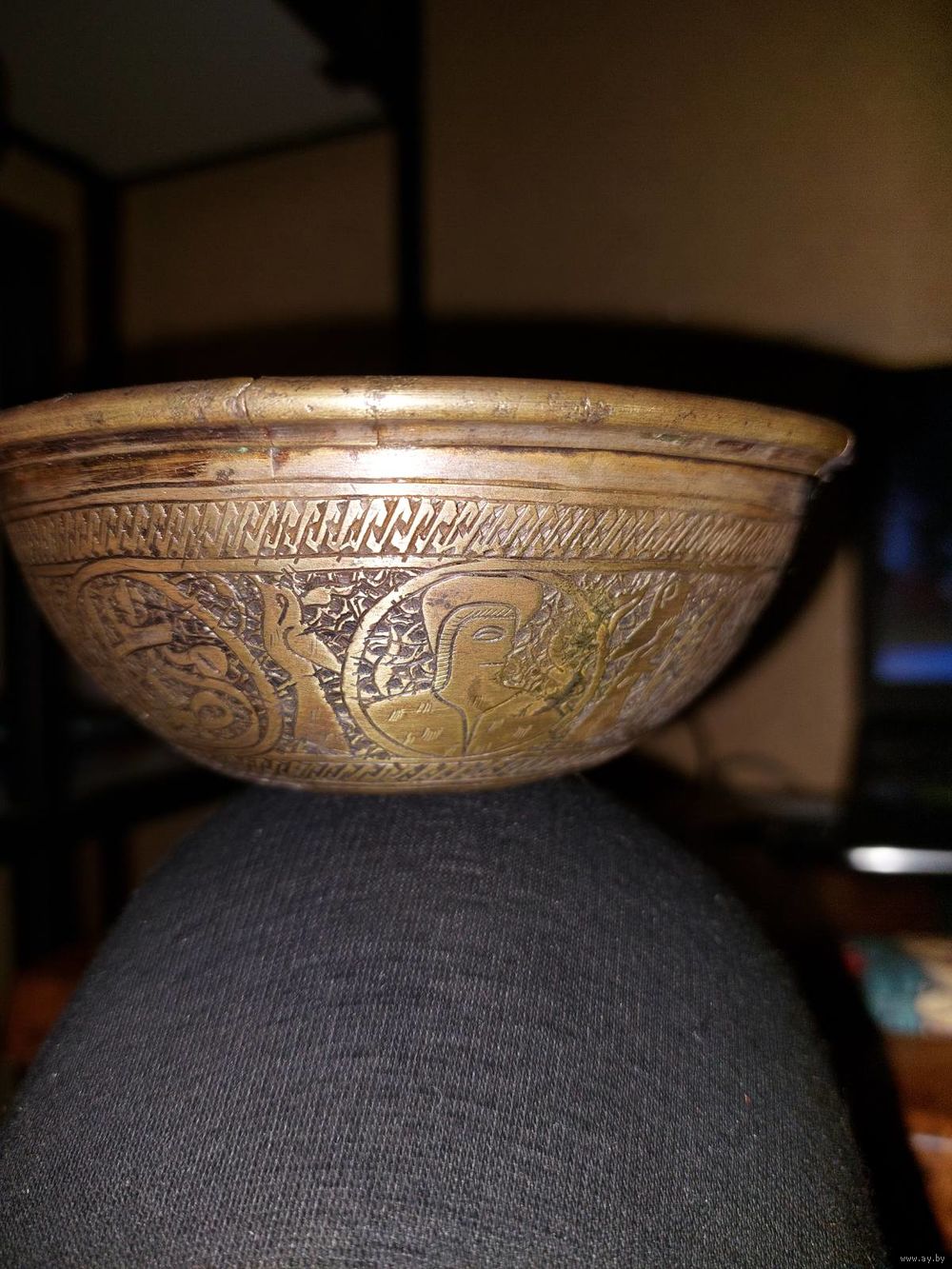 Старинная чаша с разными святыми. На дне два существа у дерева.