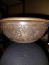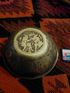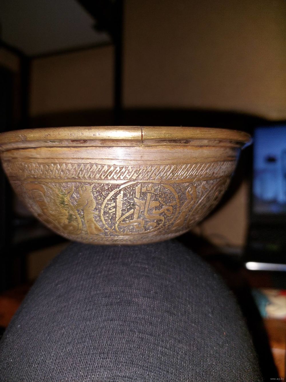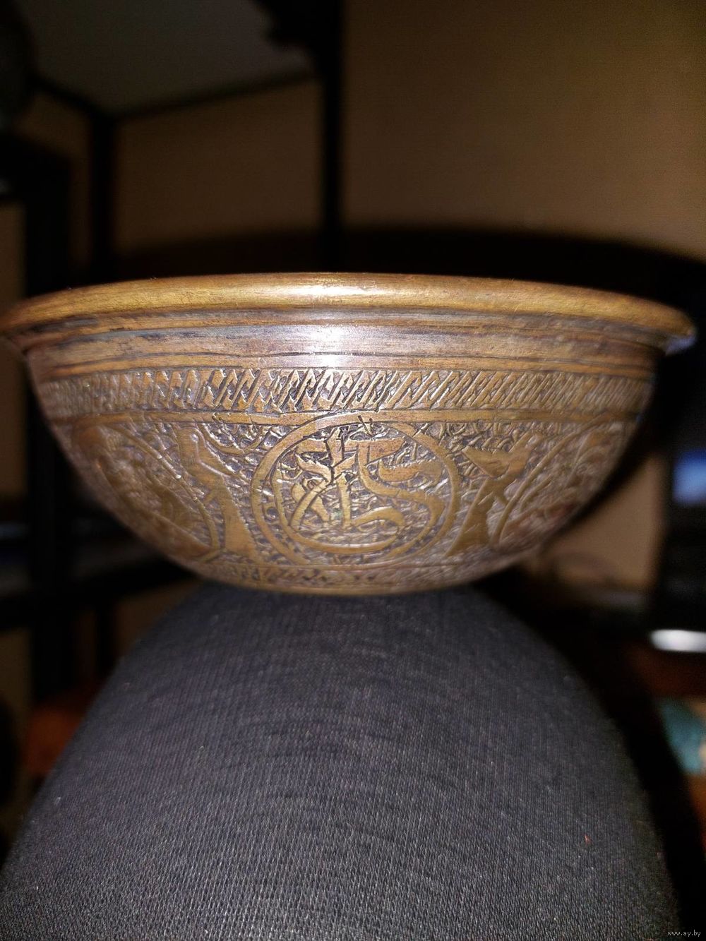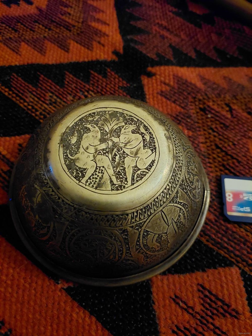 Старинная чаша с разными святыми. На дне два существа у дерева.