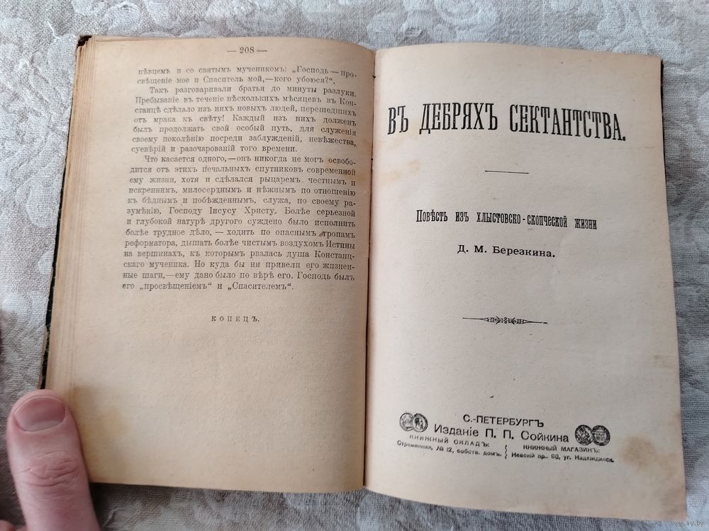 Вторая книга достаточно редкая и ценная «В дебрях сектантства» (полное название: «В дебрях сектантства. Повесть из хлыстовско-скопческой жизни») — произведение Д. М. Березкина, вышедшее в Санкт-Петербурге в 1904 году, которое является бытовой повестью, описывающей жизнь русских сектантских групп хлыстов и скопцов. Это редкая, дореволюционная книга, которая представляя собой интерес для коллекционеров старинных изданий.