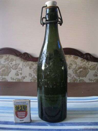 Высота бутылки - 26 см . Емкость - 0,5 л . Надпись на бутылке гласит: "AKTIENBRAUEREI zum LOWENBRAU MUNCHEN". Смотрите фото.