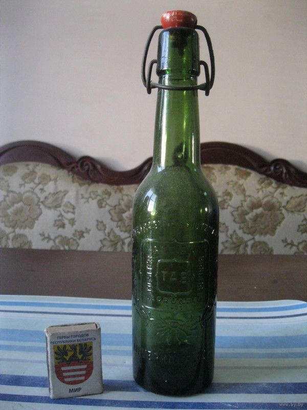 Высота бутылки - 25,5 см . Емкость - 0,33 л . Надпись на бутылке гласит: "EINGETRAGENE SCHUTZMARKE. TILSITER ACTIEN BRAUEREI(TAB) GEGRUNDET 1871. UNVERKAUFLICH. 34 A. Смотрите фото.