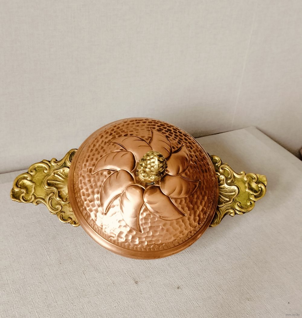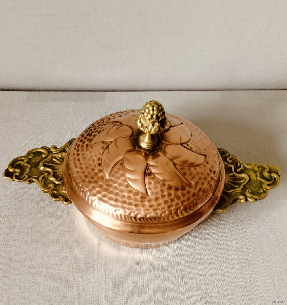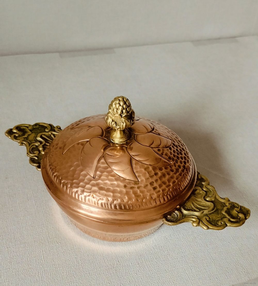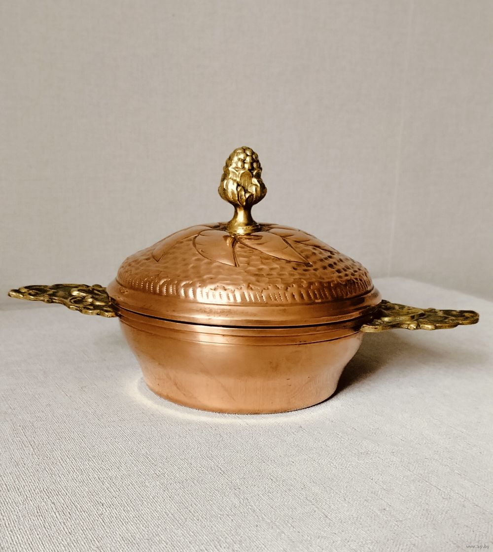 Старинная бонбоньерка, сахарница, конфетница из меди с красивыми бронзовыми массивными ручками, украшенными популярными в конце 19 - начале 20 века стилизованными ракушками в стиле "рокайль".