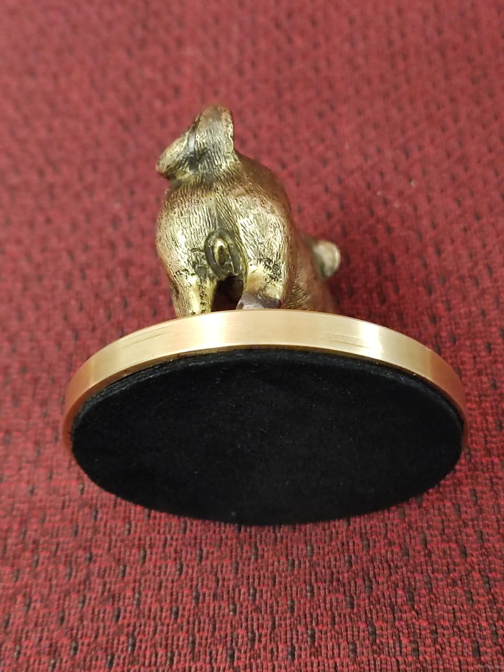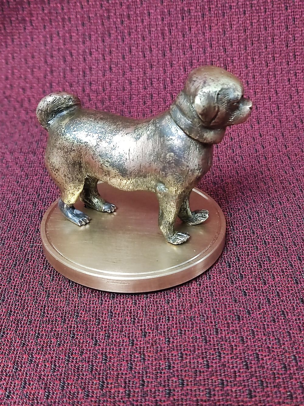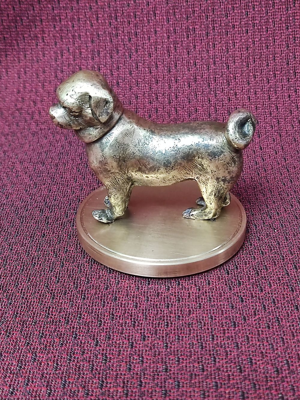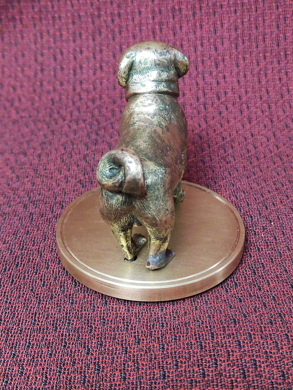 Старинная статуэтка бронзовая Мопс цельно литая на латунной подставке. Высота 6,5 см, длина 7,2 см, диам. подставки 6,6 см. Подкладка из замши. Вес 454 гр. Отличный сувенир (подарок)!
