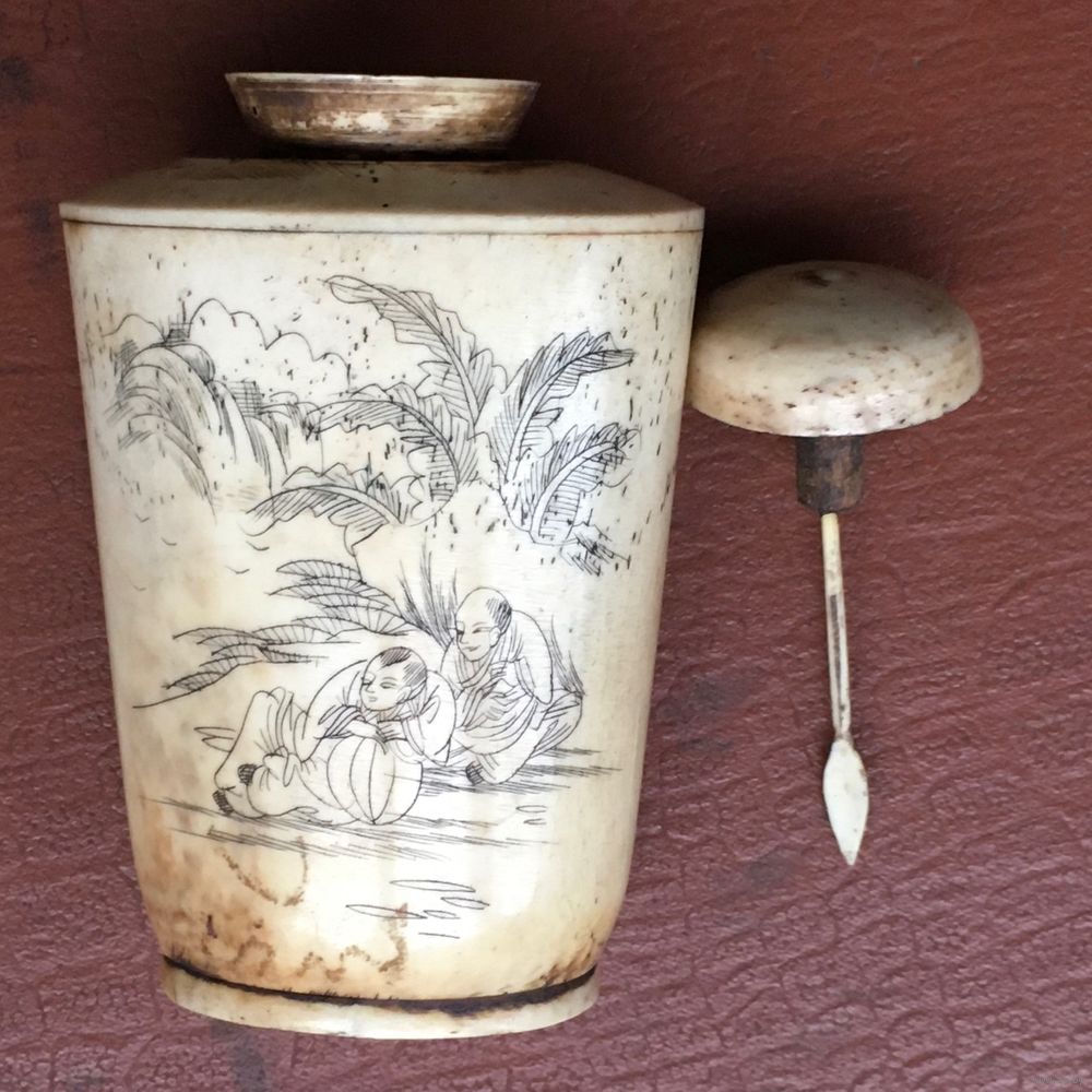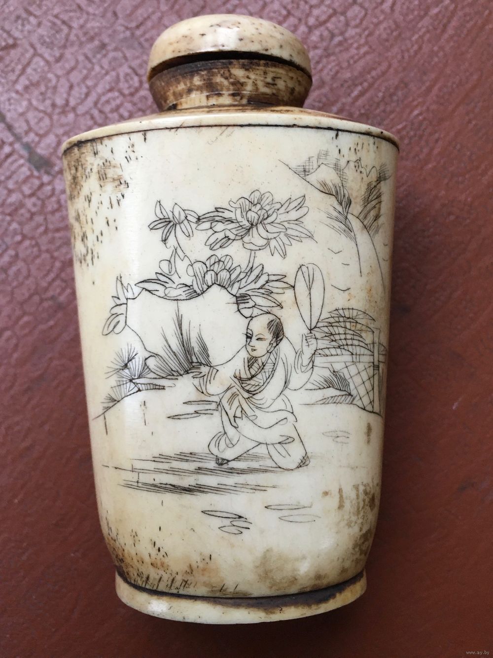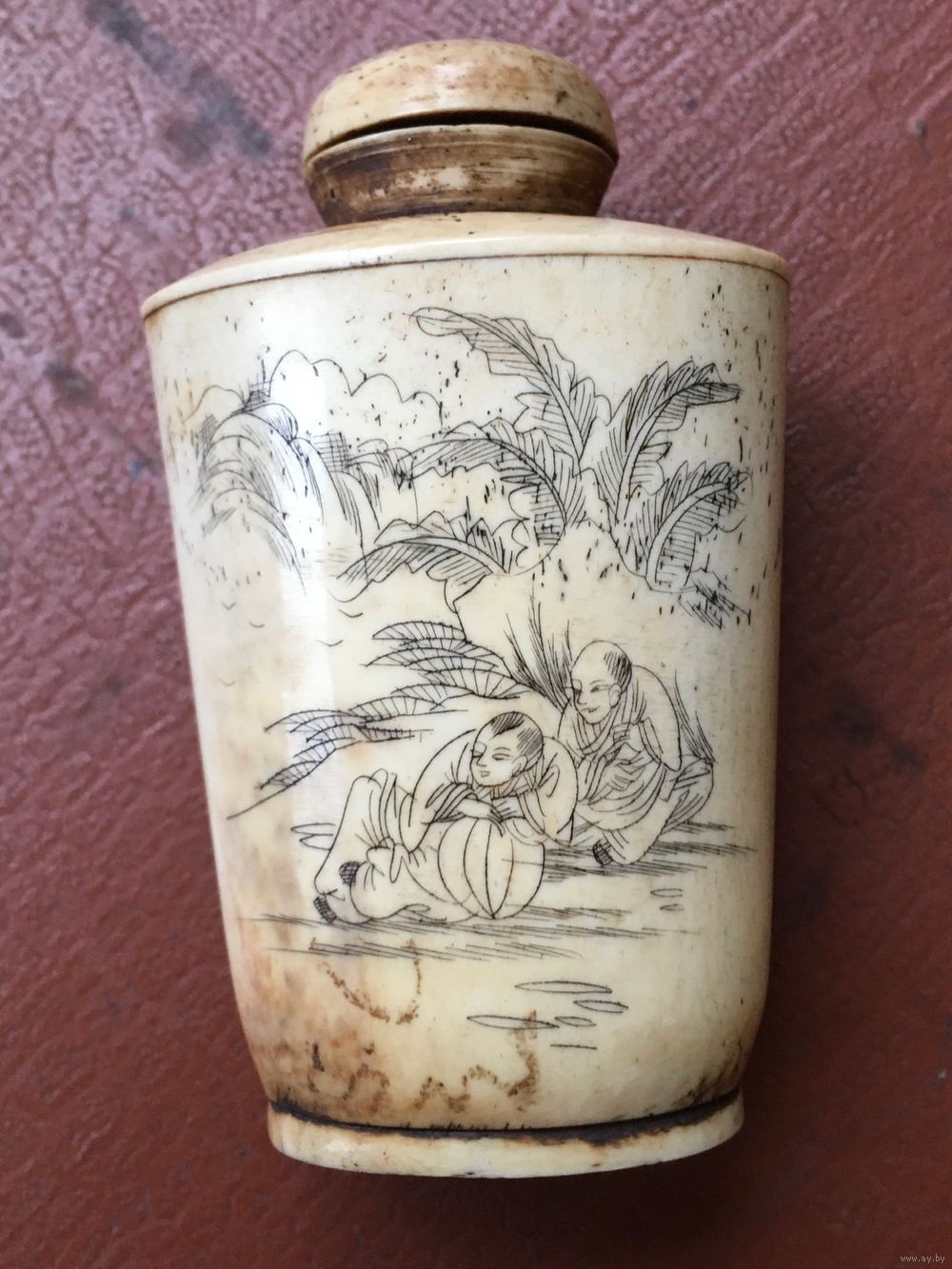 Китай, 1-я половина 20 века, кость тонкий штихельный рисунок, на дне табакерки аукционная наклейка ( предмет приобретён на аукционе в Гонконге), высота 9 см