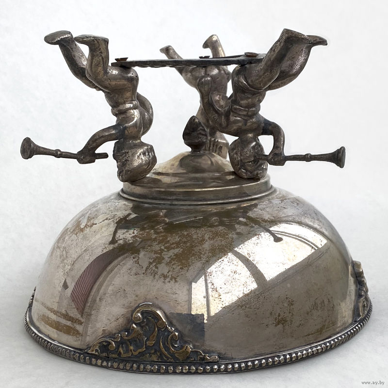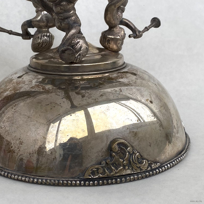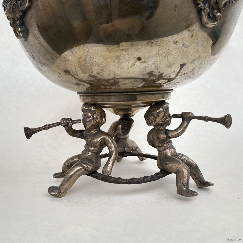 Старинная ваза фруктовница на трех путти. Западная Европа, конец 19-го-первая половина 20-го века. Латунь/бронза. Высота 18 см, диаметр 23 см. Следы бытования и времени, есть патина на металле.