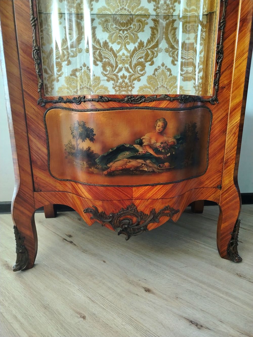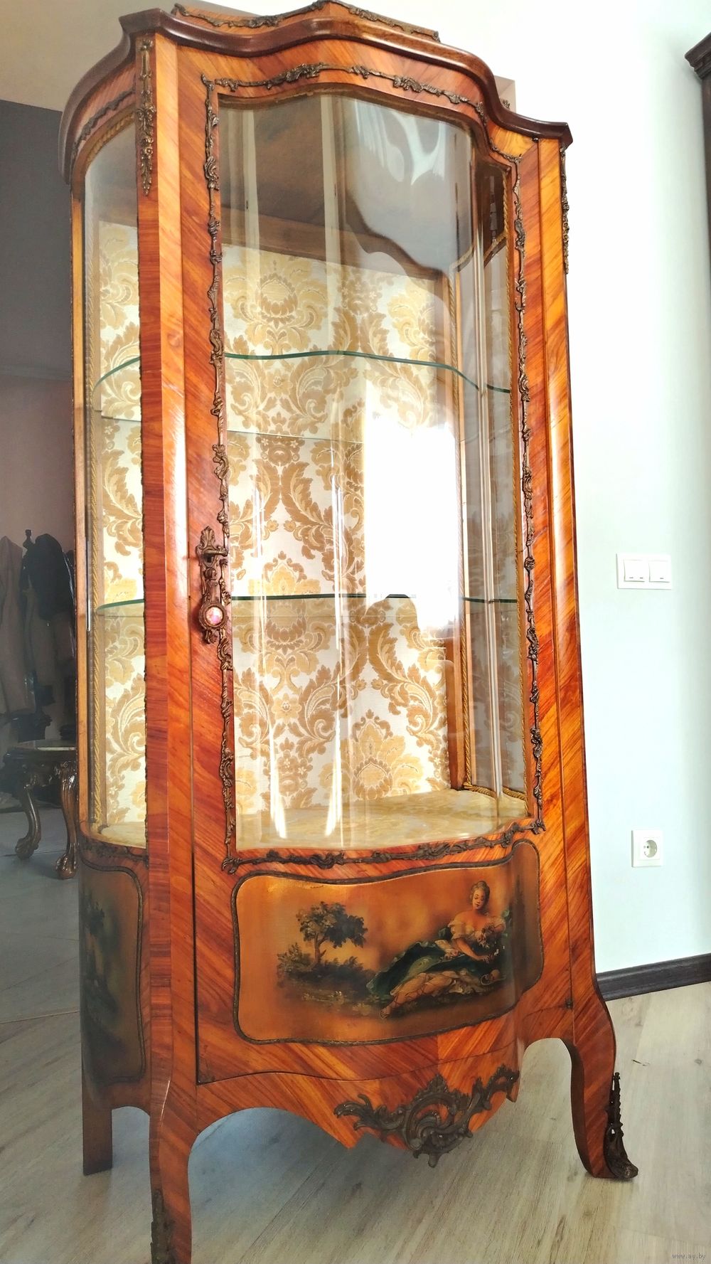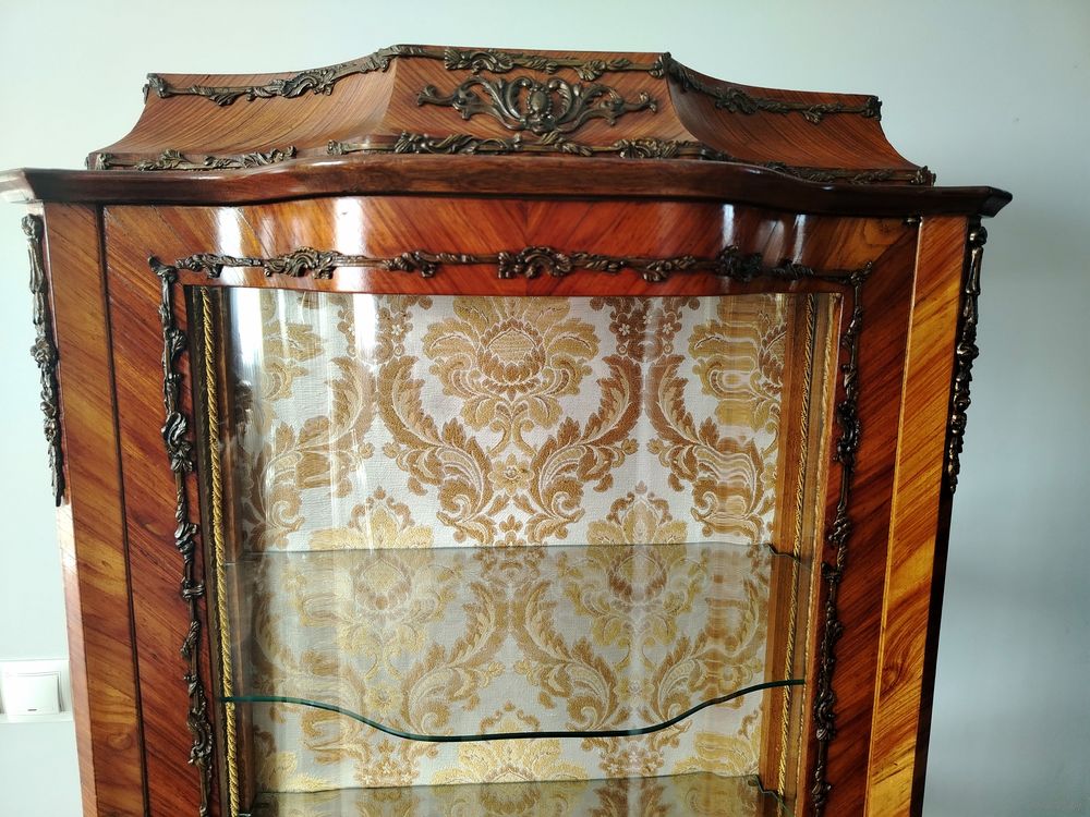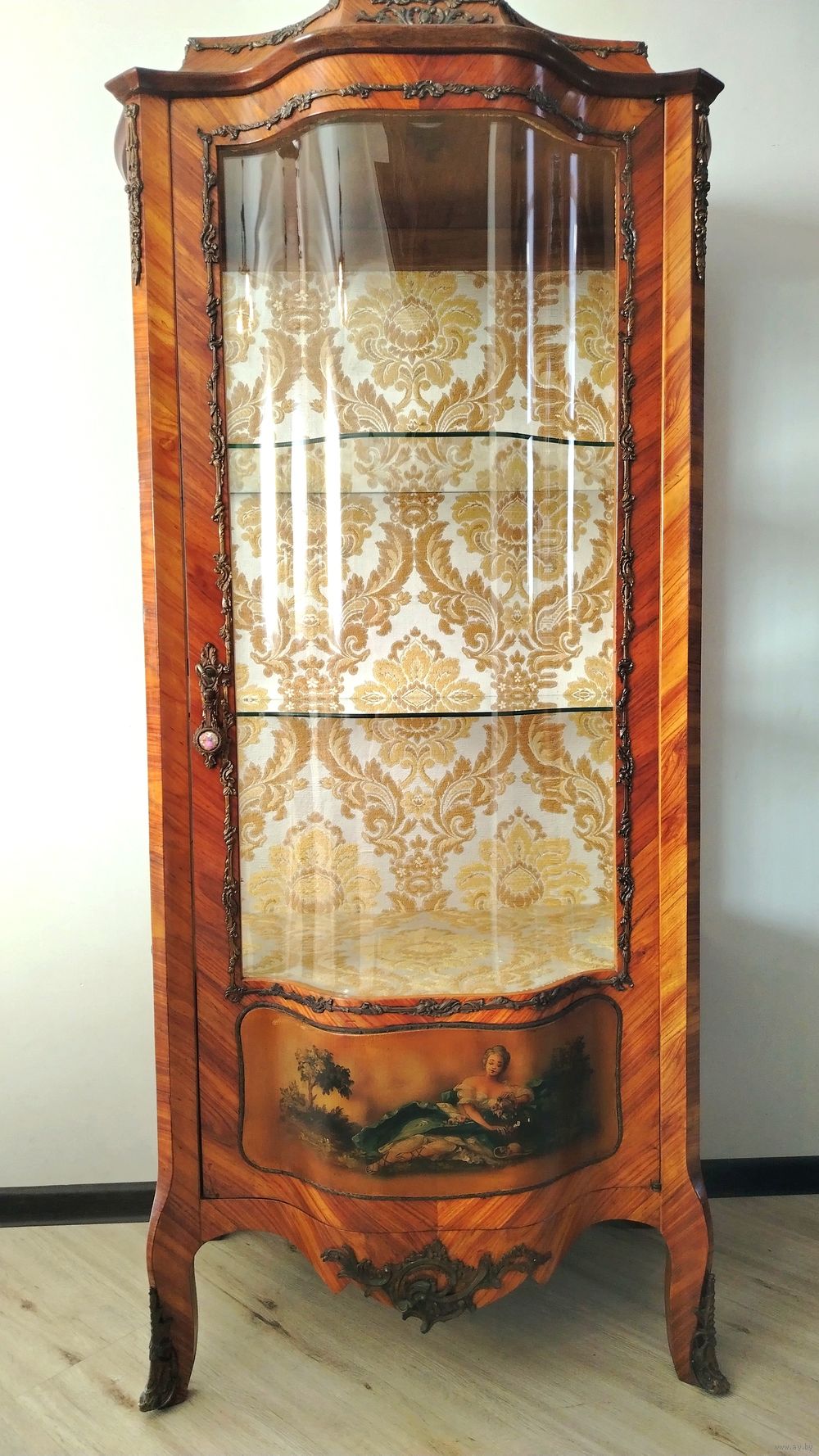 Старинная витрина. Европа. Массив дерева, техника маркетри, бронзовые элементы, художественная роспись. Высота 160см ширина 75см глубина 50 см.
