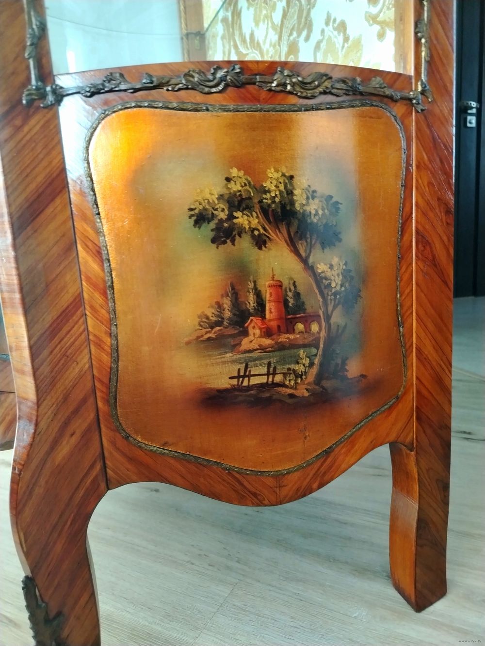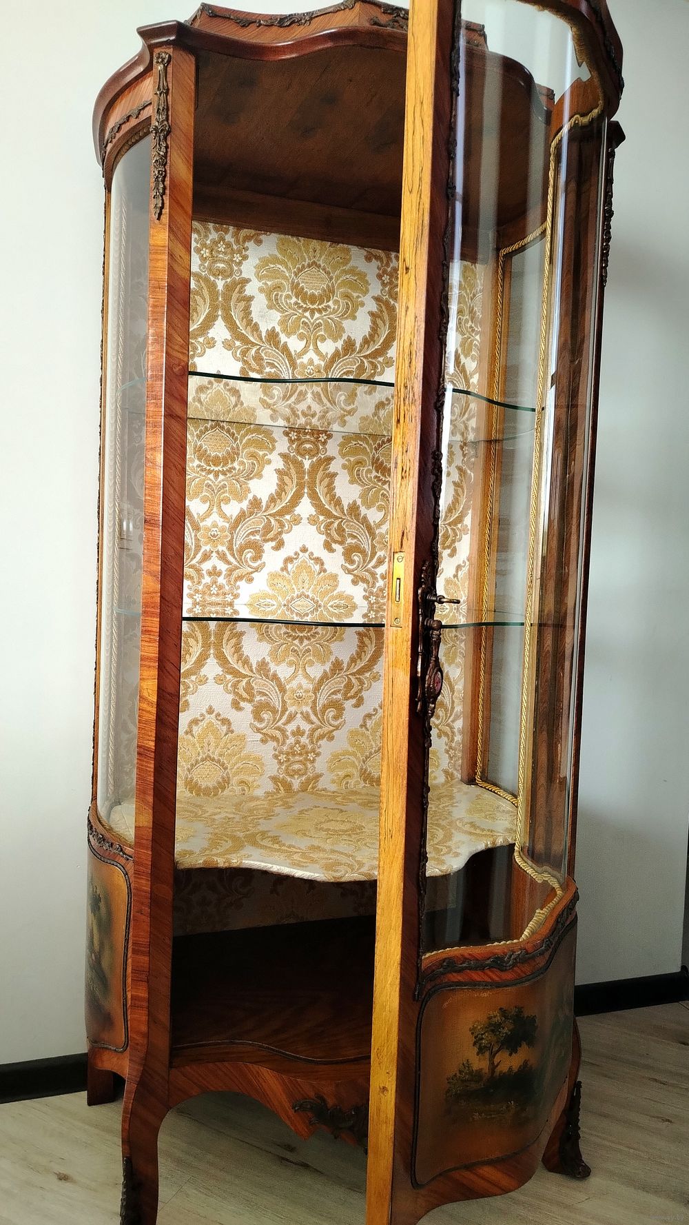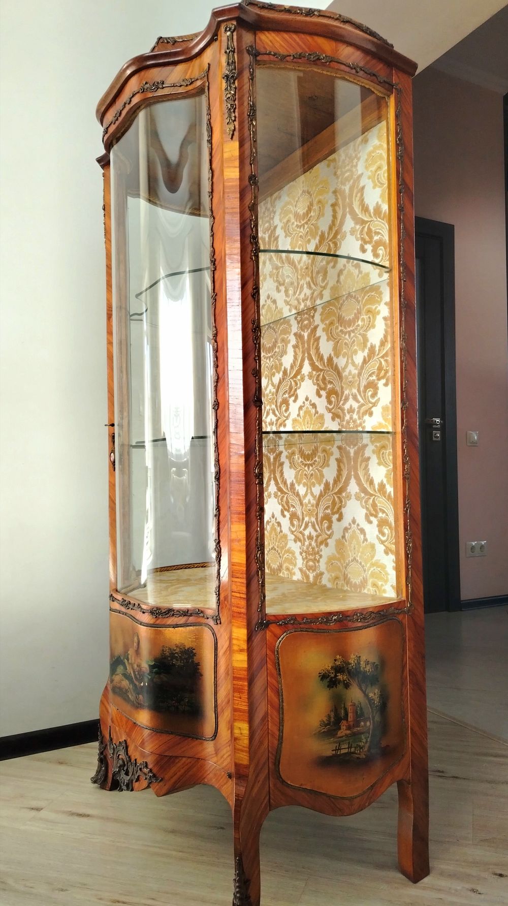 Старинная витрина. Европа. Массив дерева, техника маркетри, бронзовые элементы, художественная роспись. Высота 160см ширина 75см глубина 50 см.