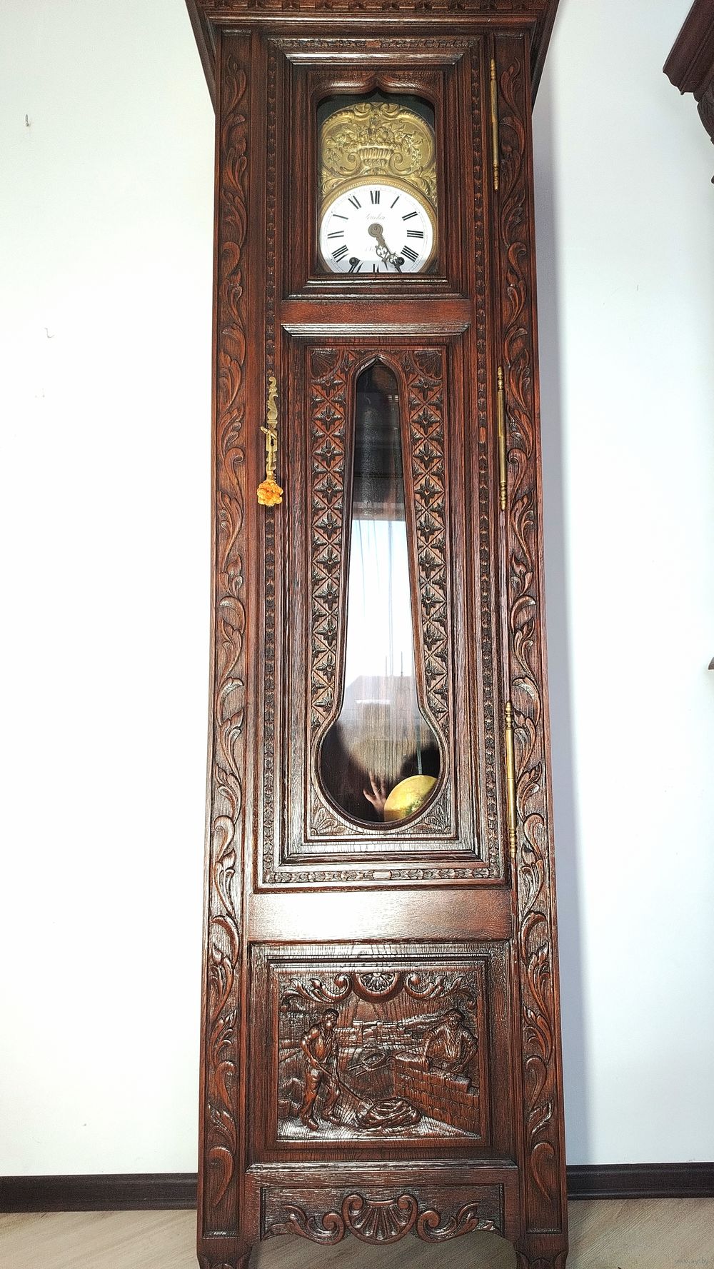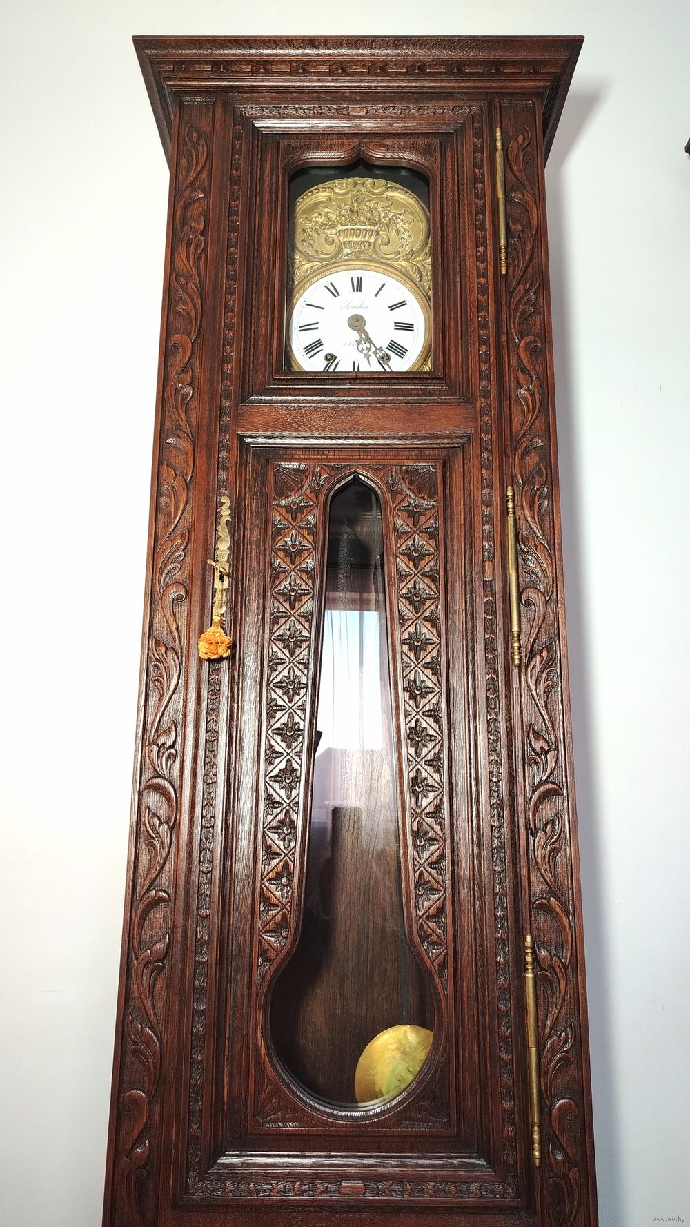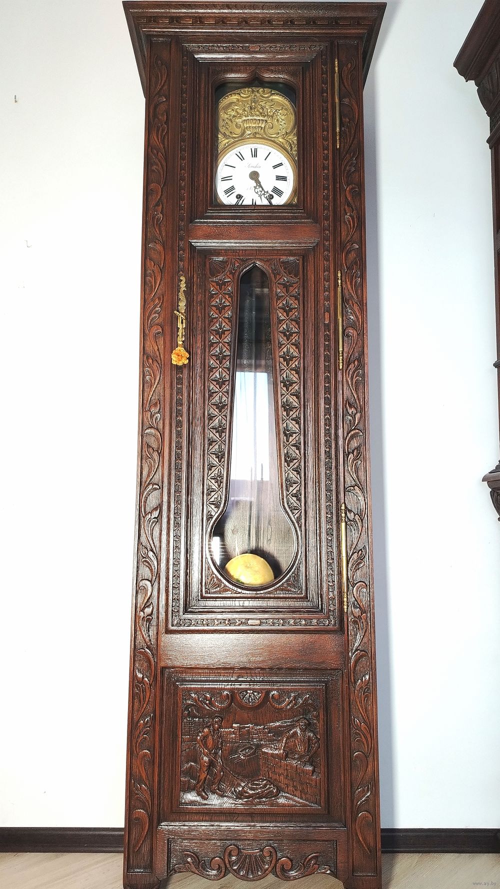 Старинные часы. Европа. Корпус массив дуба с красивой резьбой. Механизм в рабочем состоянии с боем на час и на полчаса. Высота 220см ширина 57см глубина 33см.