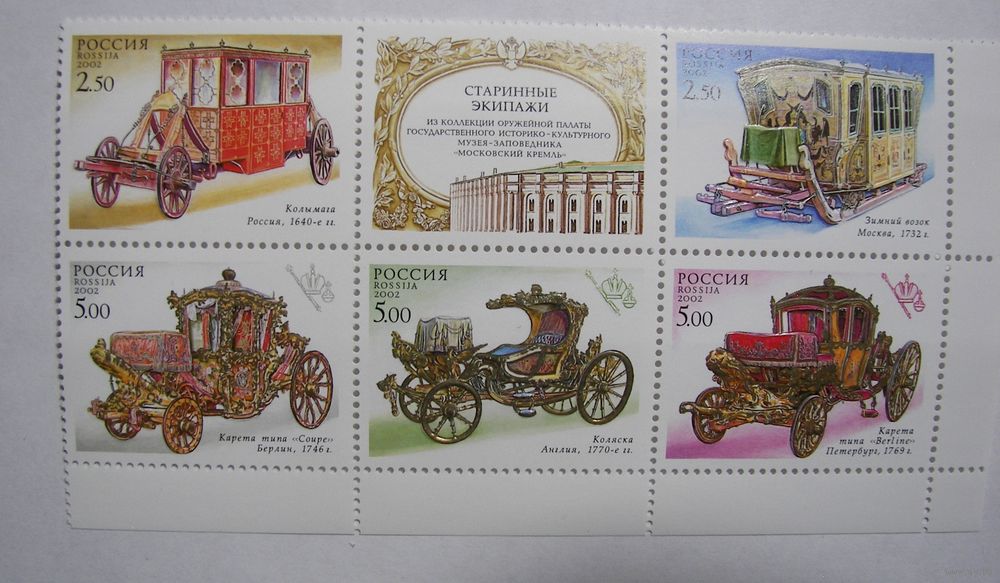 Старинные экипажи. 5м.+купон. 2002г.